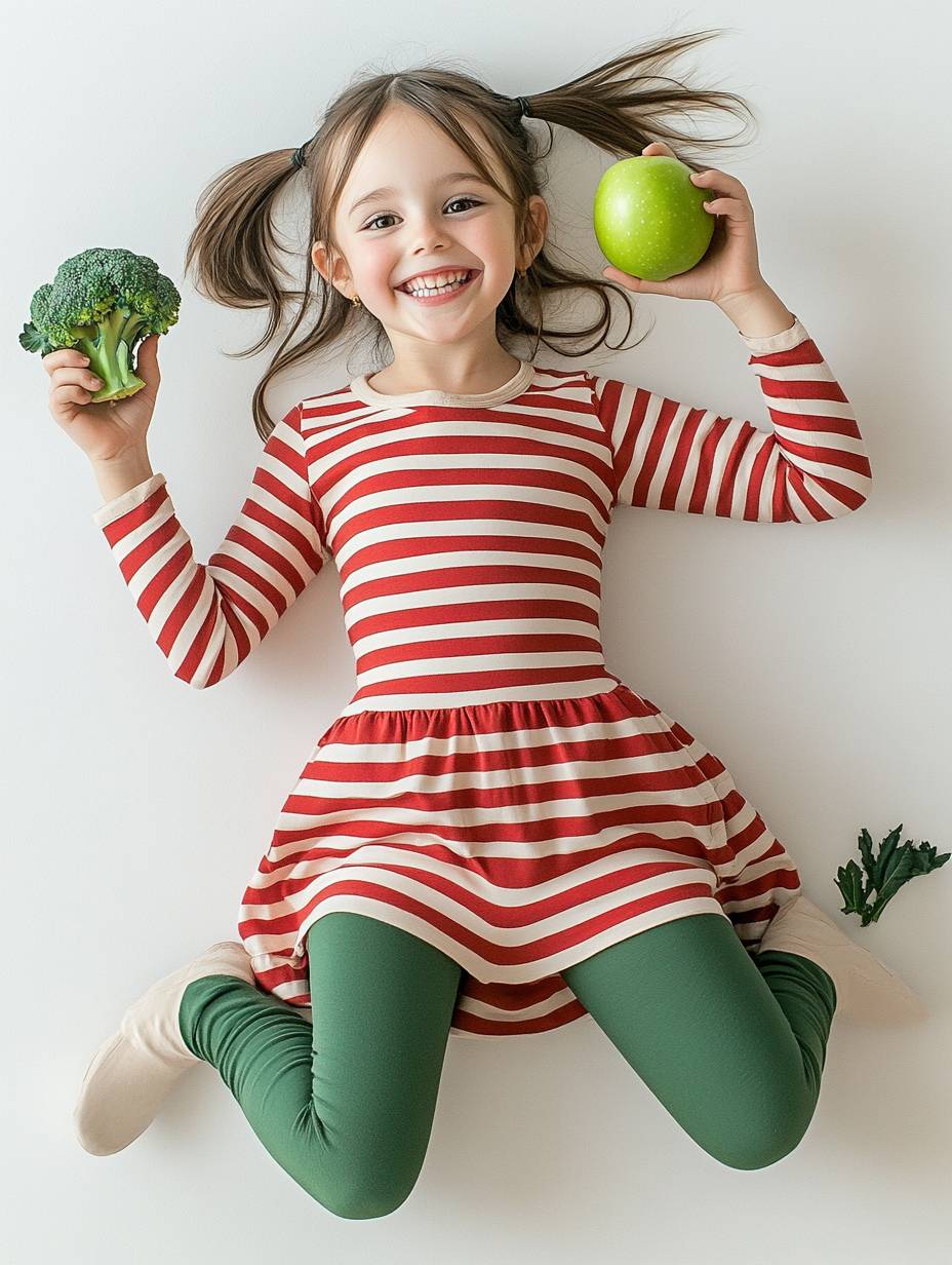 Studio photography of a , studio photography, A 12 year old girl lying on the floor with pigtails wearing a red and white striped dress and green leggings smiles and holds a broccoli in one hand and an apple in the othe hand right above her eyes, white background --no close-up --ar 3:4 --stylize 250 --v 6.1