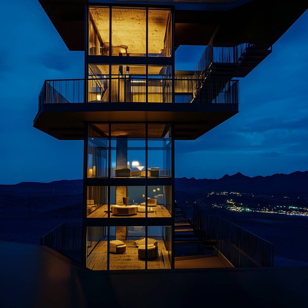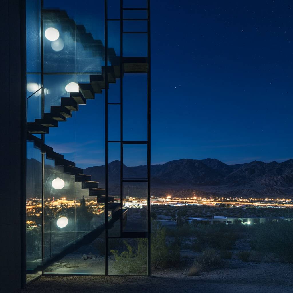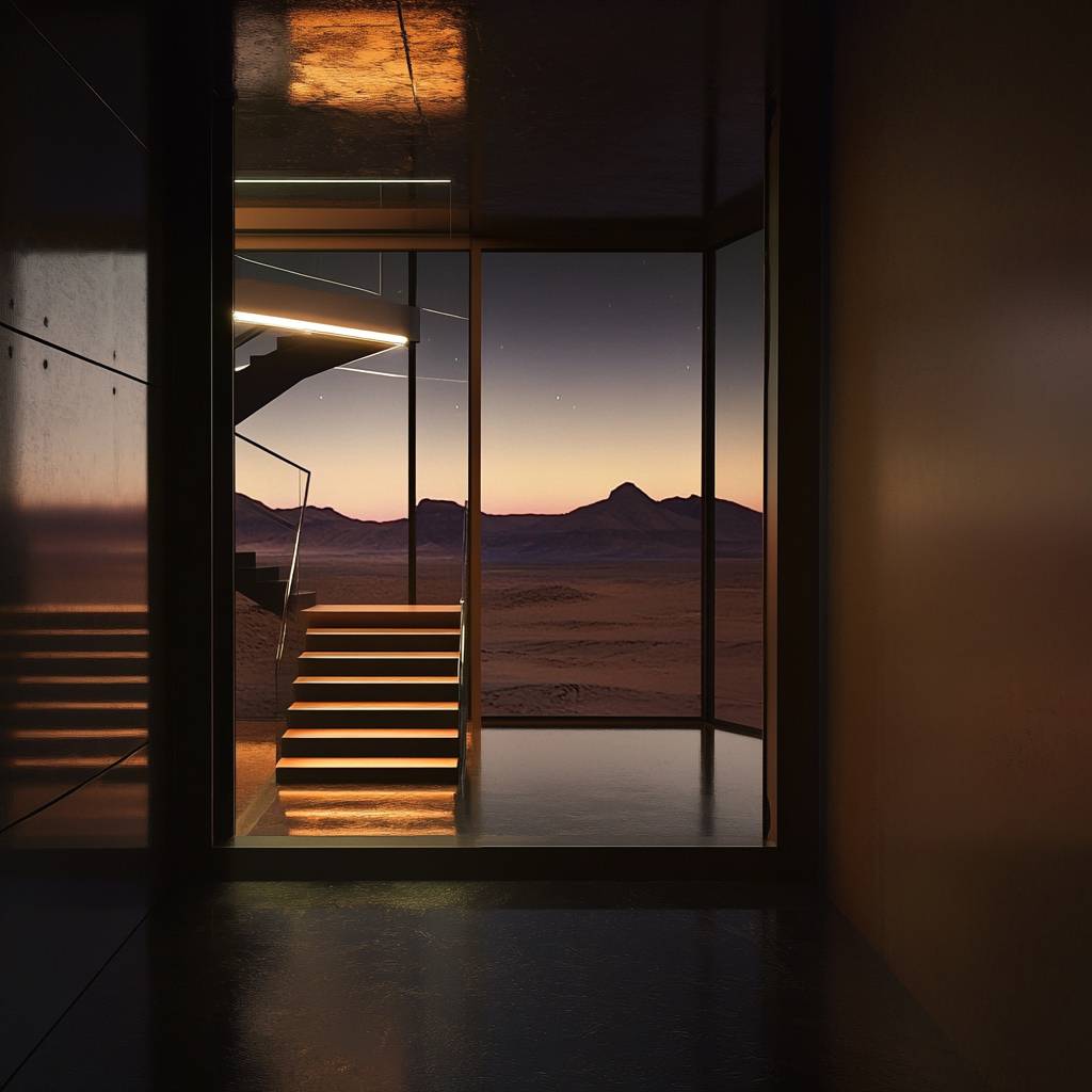 desert night view stairs leading from apartment window control tower of the future rustic furniture with reflection --style raw --stylize 50 --v 6.1