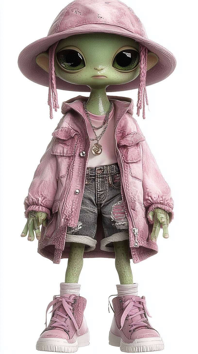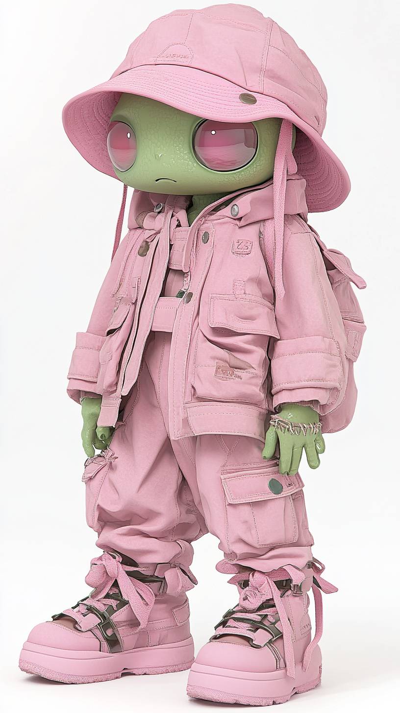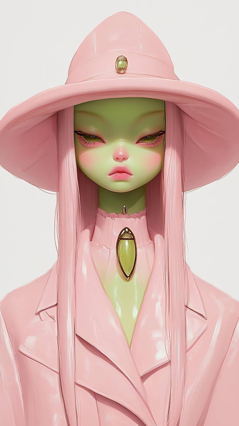 pepe girlfriend of green skinned chubi girl with pink hat and pink cothing on a white isolated background --ar 9:16 --personalize ai7ygkk --stylize 750 --v 6.1