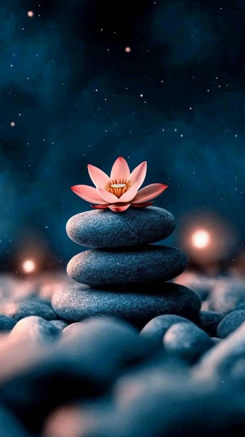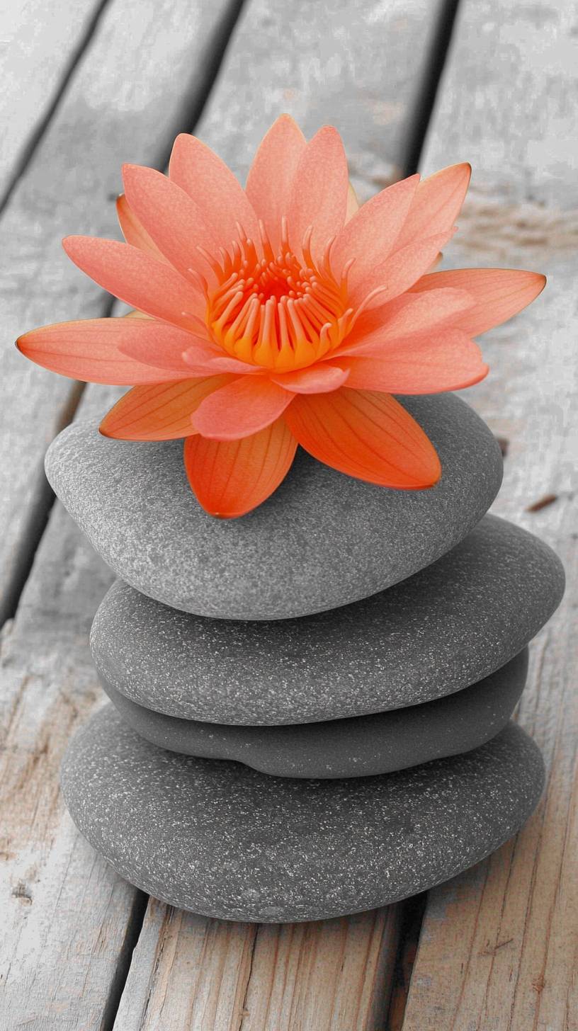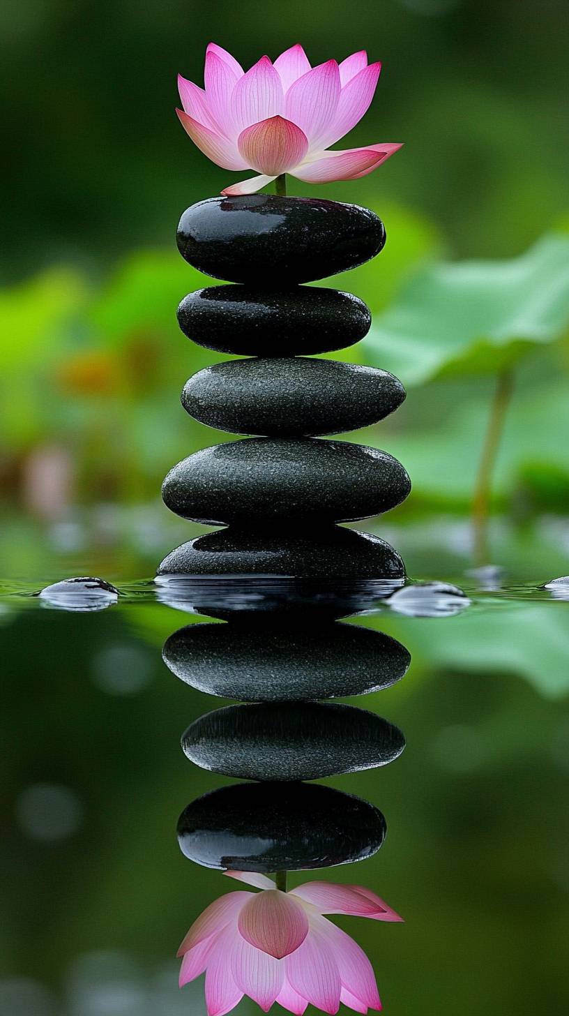 Black and gray rocks stacked on top of each other with a pink lotus flower, in a spa setting, photo-realistic. --chaos 100 --ar 9:16 --stylize 250 --v 6.1