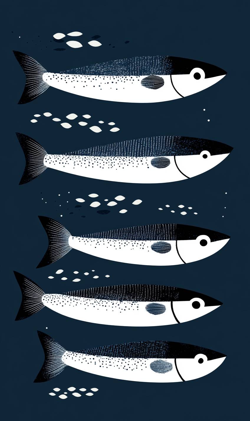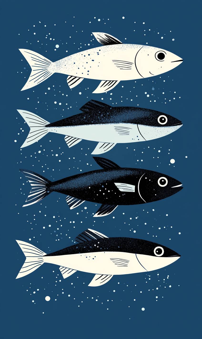 Una ilustración simple de peces en blanco y negro sobre un fondo azul sólido, con formas audaces y contraste visual en un estilo minimalista.