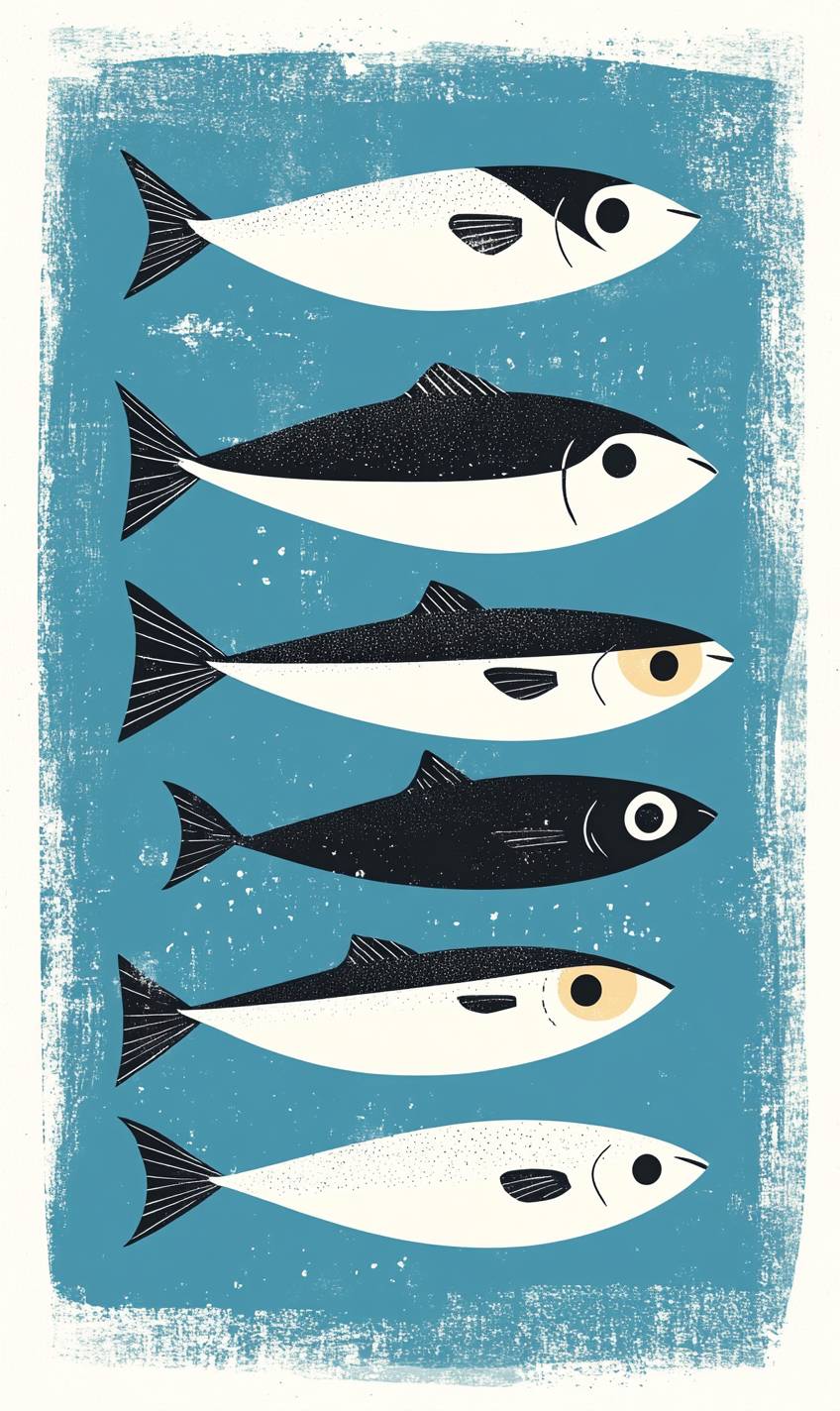 a simple illustration of 5-6 black and white fishes , risograph print, flat vector, minimalist poster, flat color, solid blue background, bold shapes and solid colour, visual contrast, best quality, 32K, --ar 685:1152 --stylize 300 --iw 1.9 --v 6.1