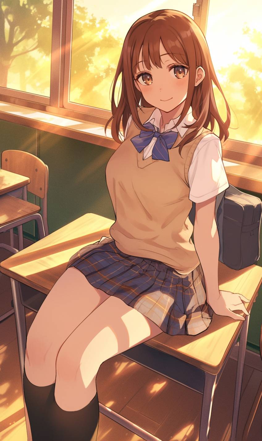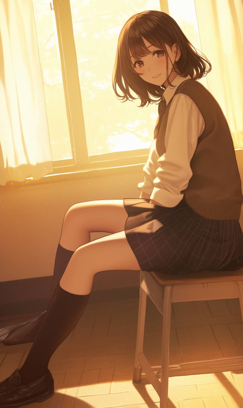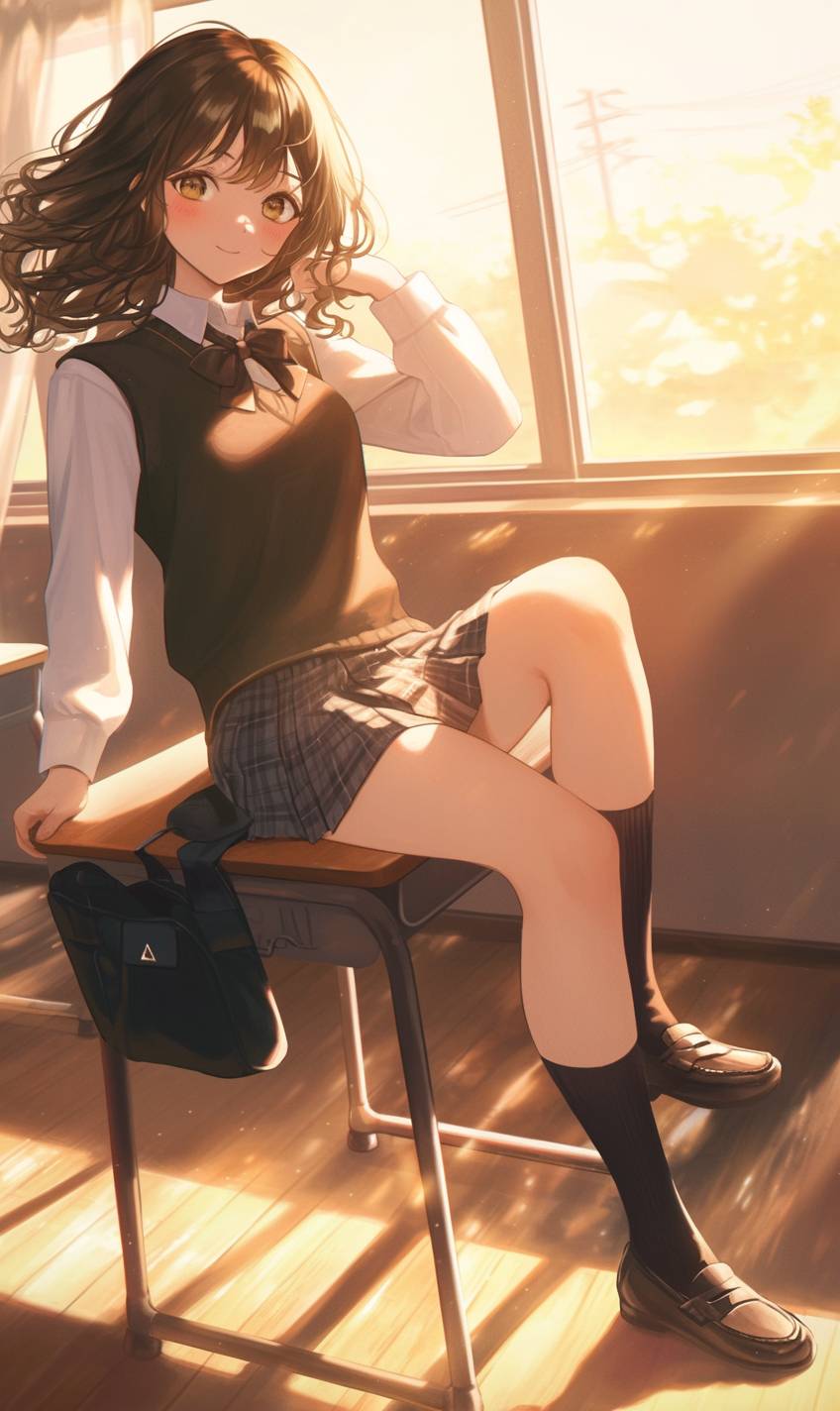 Yukina Shirakawa, elegancia colegial, chaleco de suéter, falda, mocasines, aula soleada