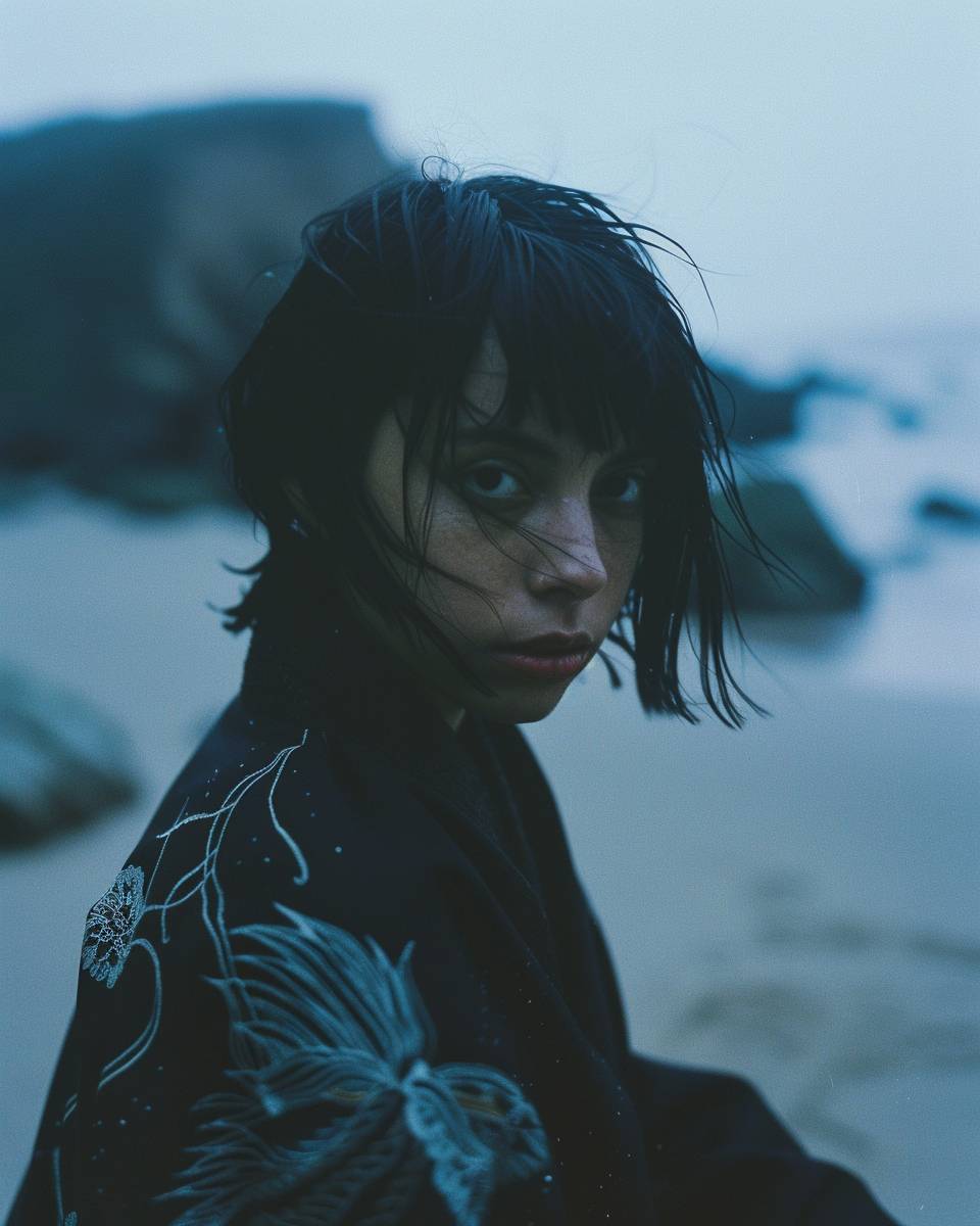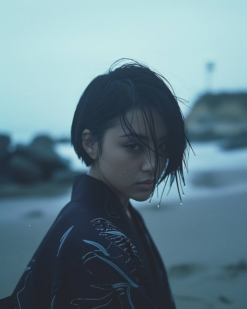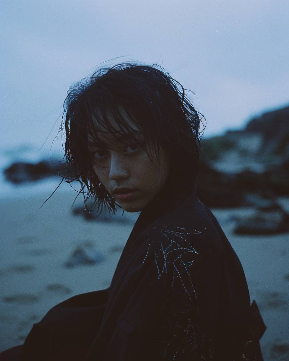 A photograph of a young adult Asian woman with short black hair, wet hair look, intense gaze, wearing a black embroidered kimono, sitting on a sandy beach with rocks in the background, overcast lighting, cinematic atmosphere, high resolution, film grain effect --ar 4:5 --style raw --sref 2813629345 --sw 50 --stylize 50 --v 6.0
