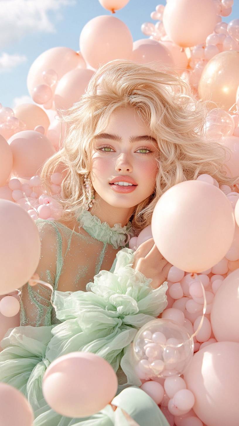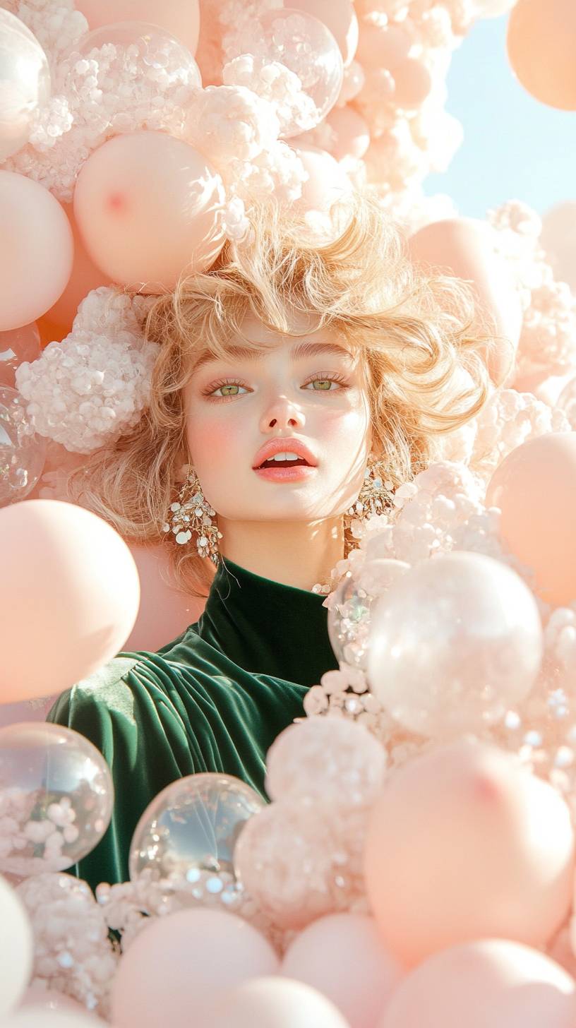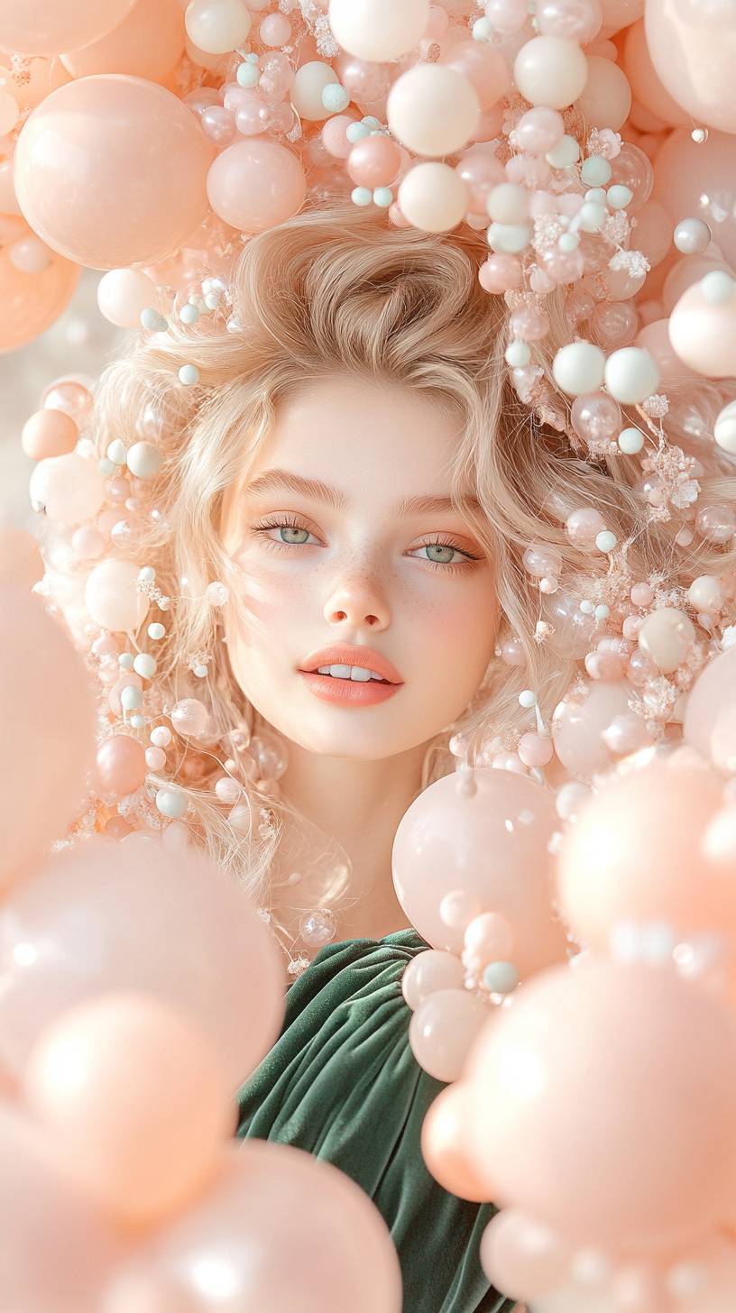 Medium shot. A fun and lively scene in which a beautiful girl, blonde with shoulder length hair, green eyes, is immersed in a sea of pink balloons, smiling happily. The balloons create a soft, whimsical atmosphere, and her green velvet Voge-style dress contrasts with the light background, making the moment playful and inviting.Shot in the style of Patrick Demarchelier.Canon EF 85mm f/1.2L II USM camera --ar 9:16 --personalize e4u5omq --stylize 1000 --v 6.1