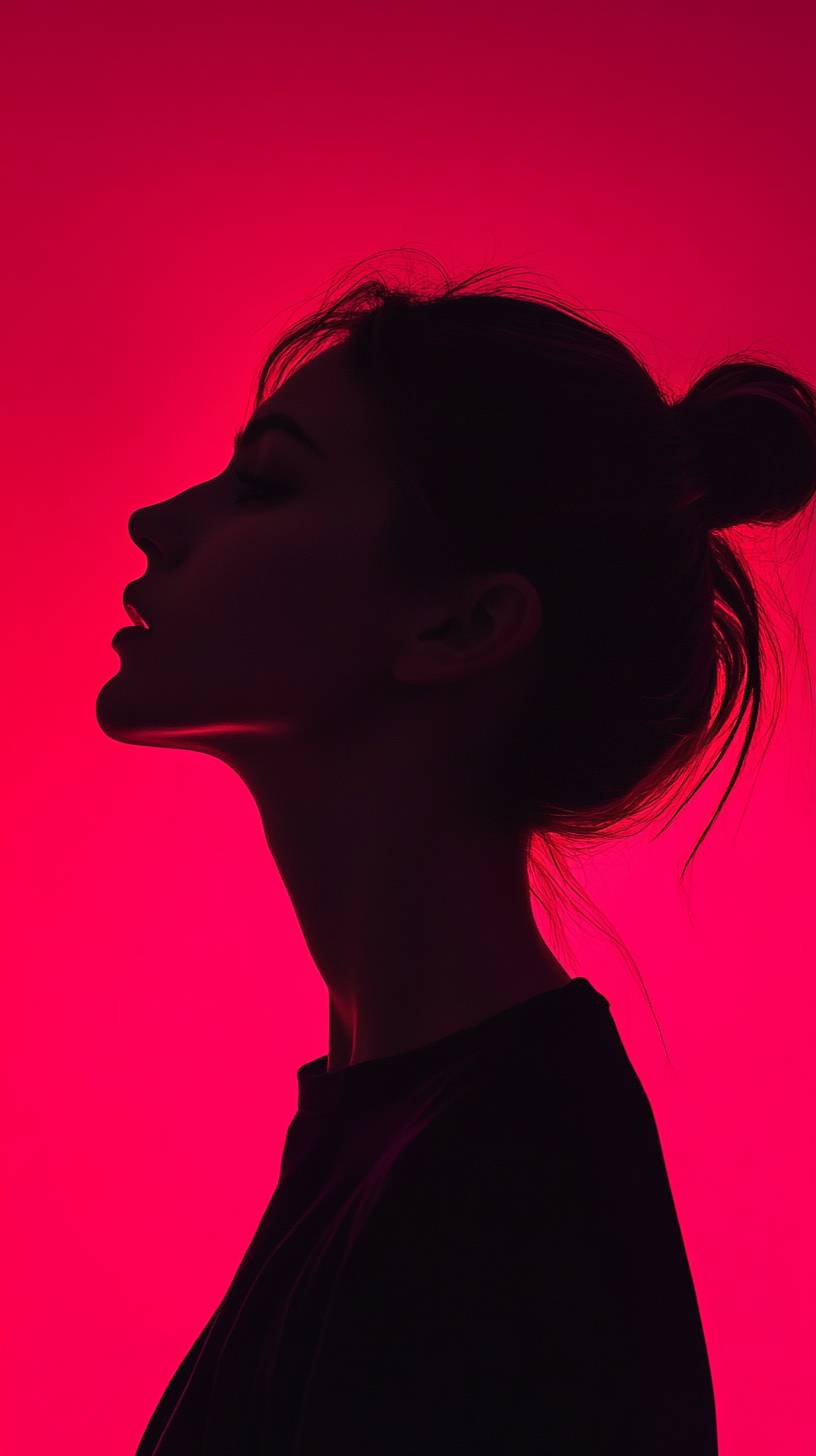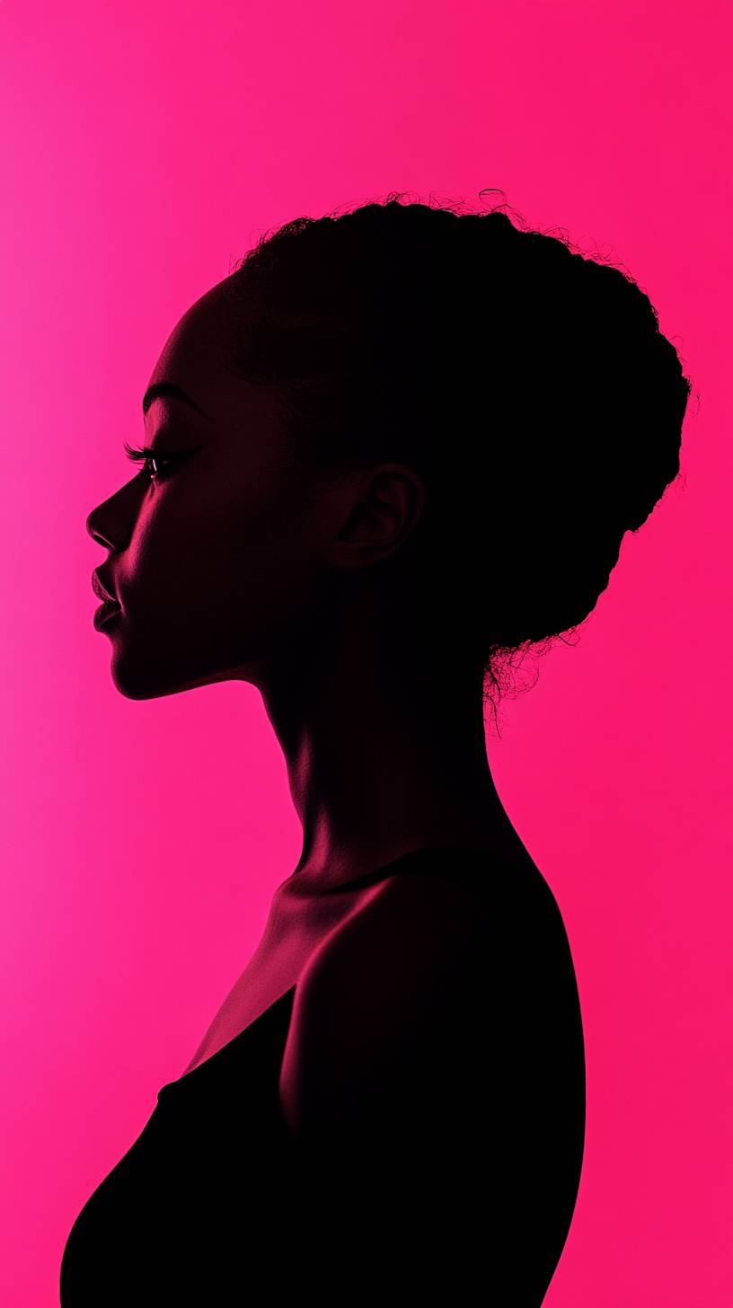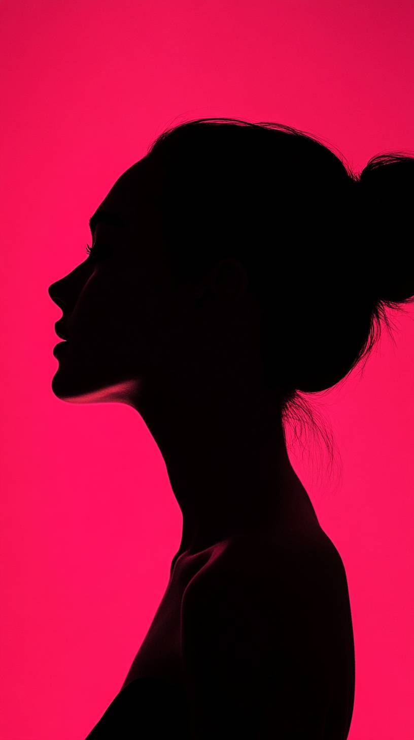photography, portrait of contrast, profile silhouette of a woman, vibrant hot pink backdrop, visualize using a camera setup that mimics a large aperture, focusing solely on the silhouette's edge, while a low ISO maintains the richness of color without grain, photorealistic, UHD --ar 9:16 --style raw --v 6.1
