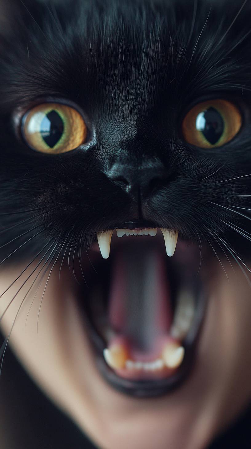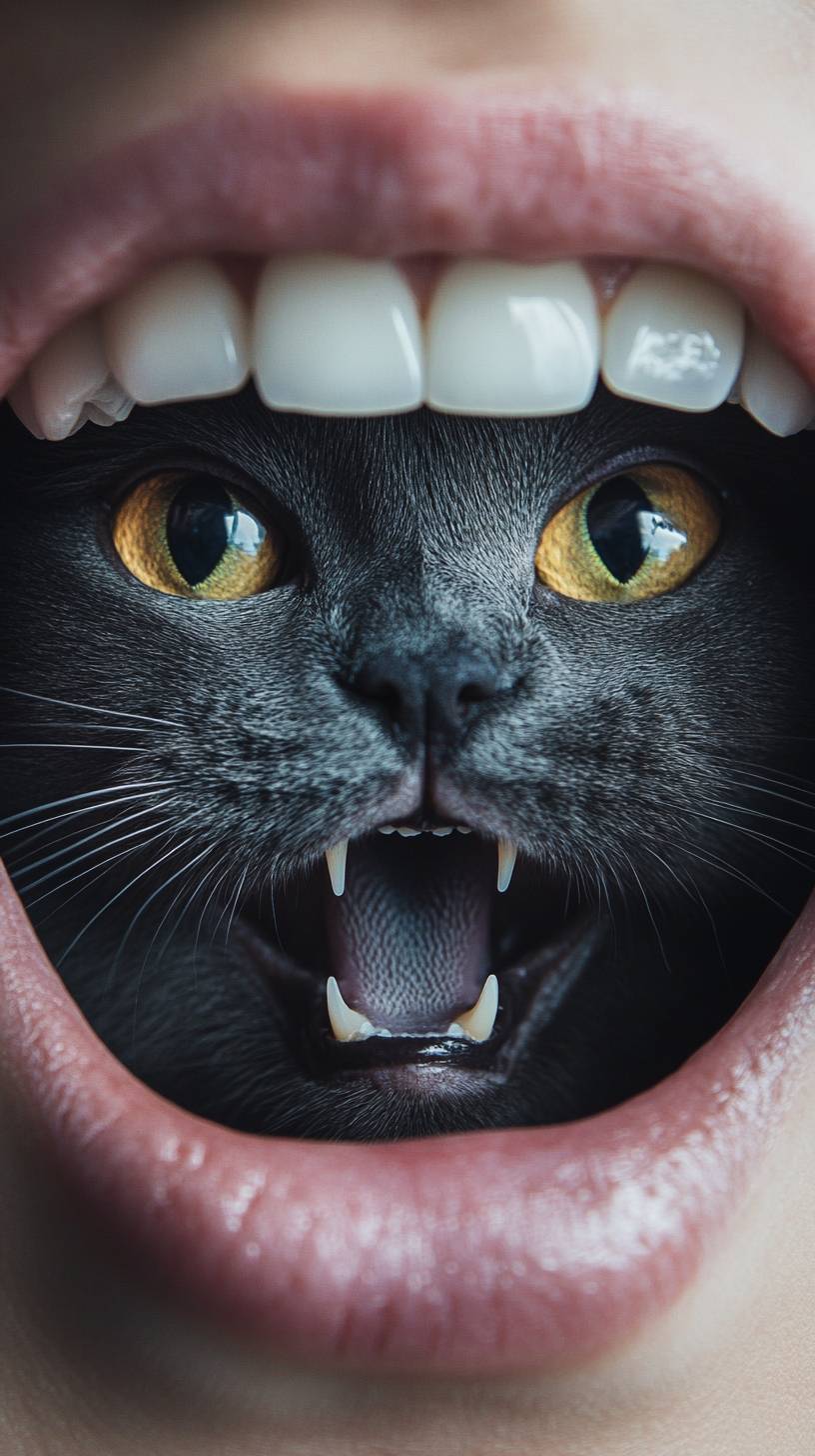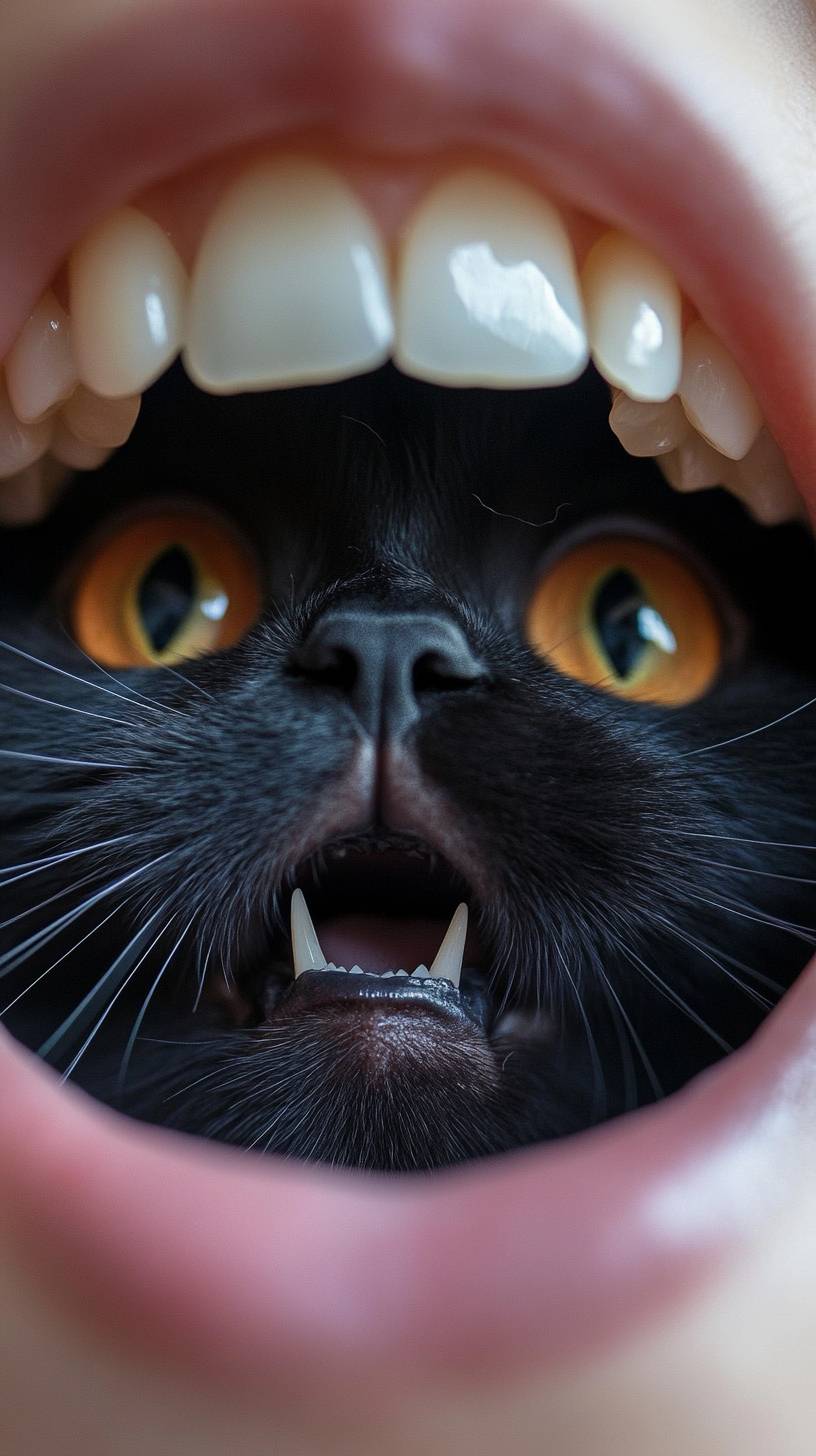 looking out from the inside of a mouth and teeth, black British shorthair cat inside a woman’s mouth behind a set of teeth --ar 9:16 --v 6.1