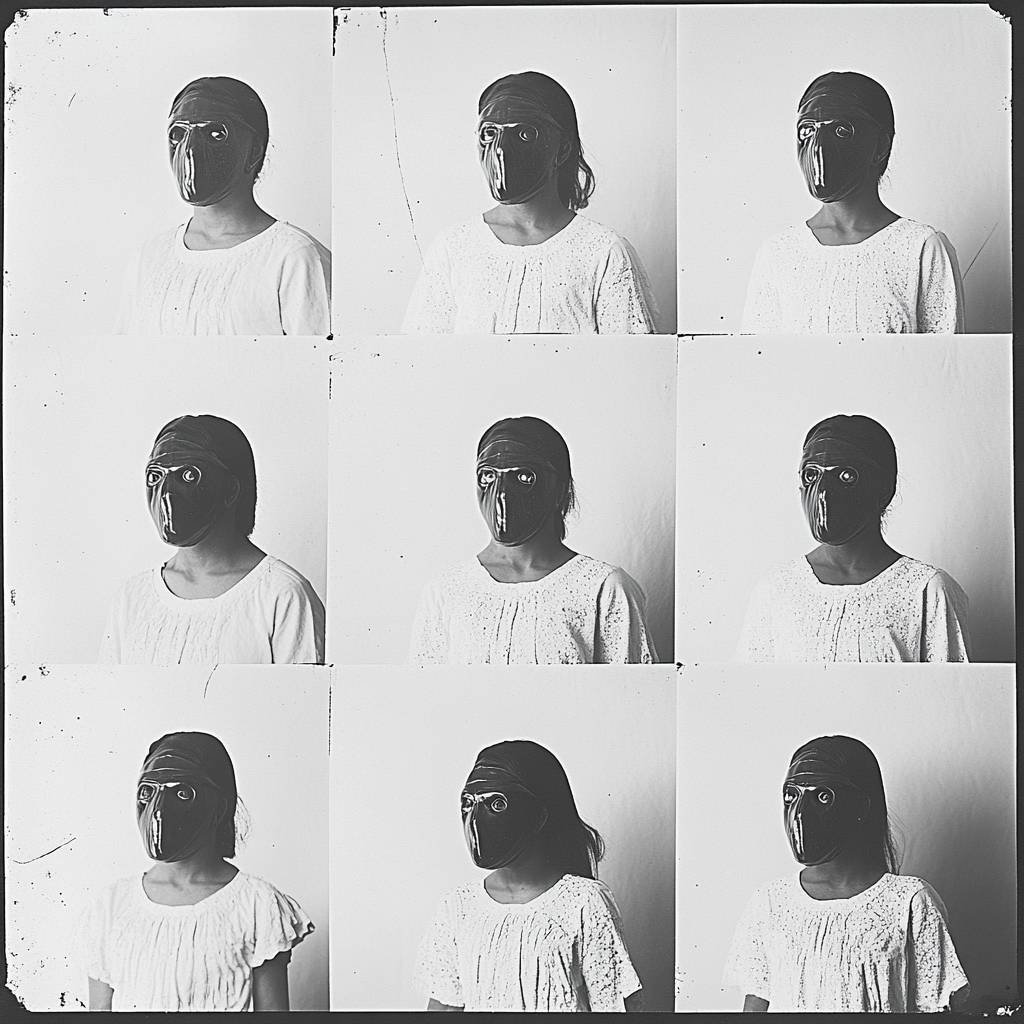 Un conjunto de fotos de prisioneros con máscaras de horror de la década de 1920, en formato de cuadrícula, asqueroso