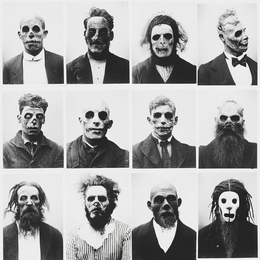 13w a set of mugshots of prisoners with horror masks from 1920s, grid, gross --chaos 33 --personalize 2jermj3 --stylize 400 --v 6.1