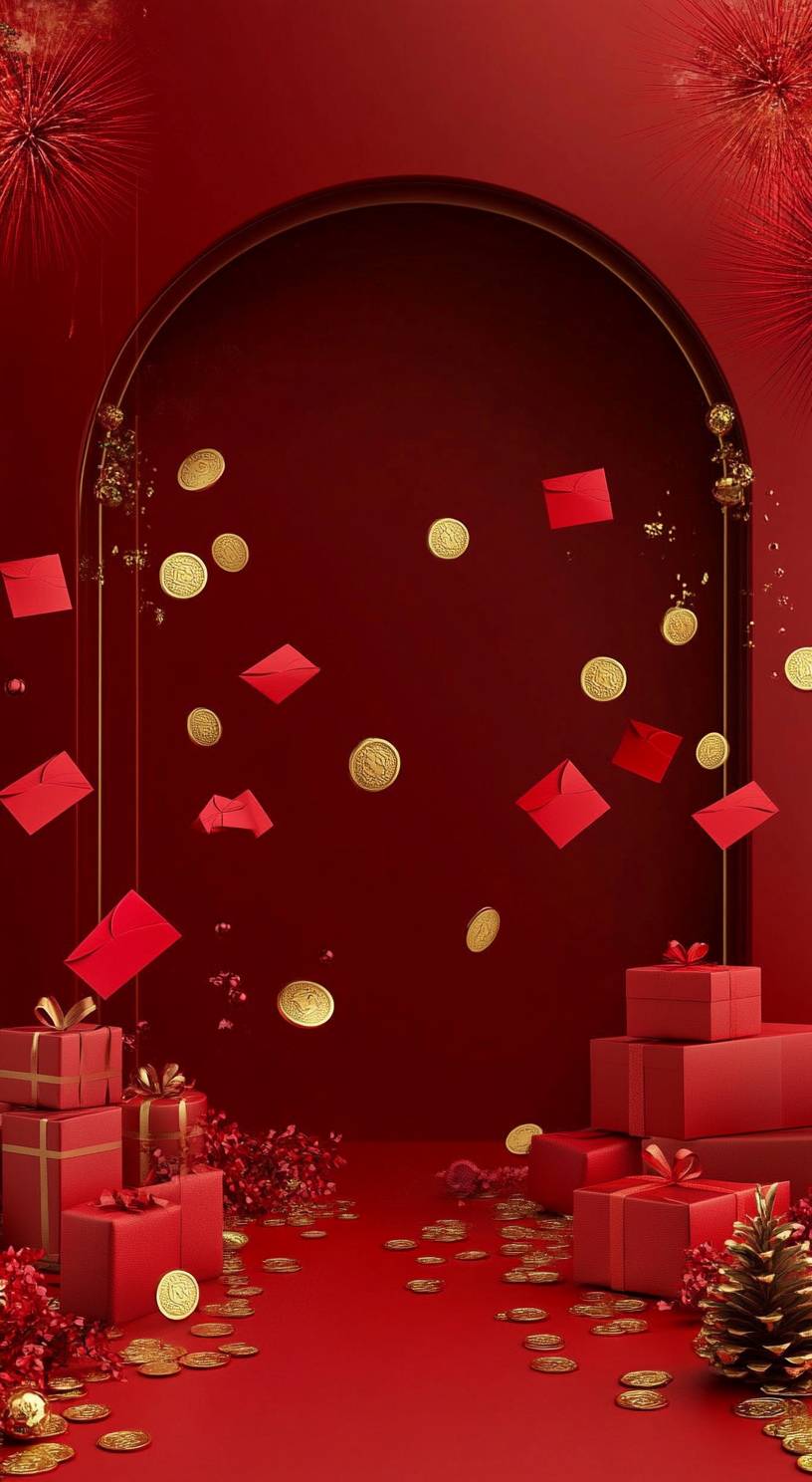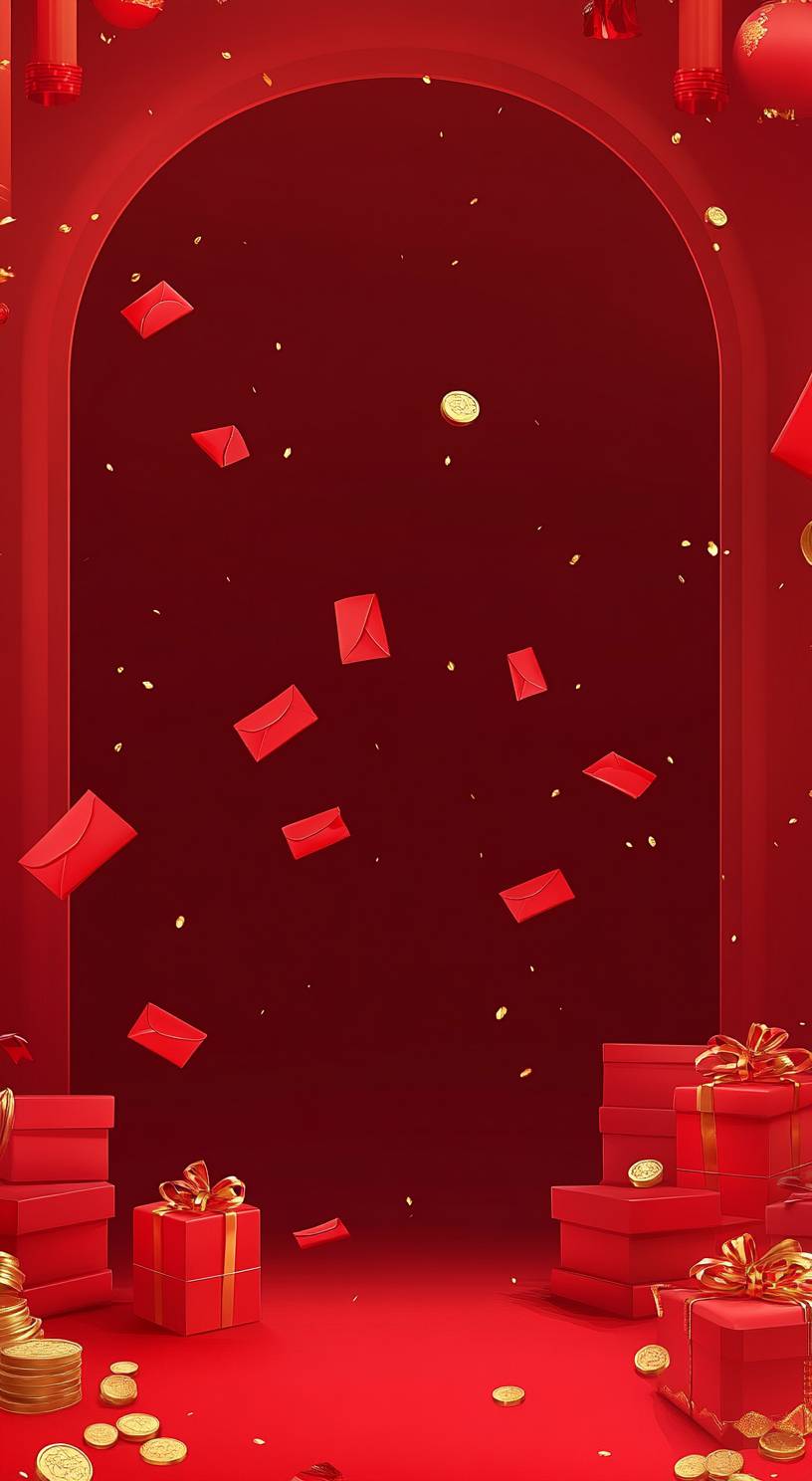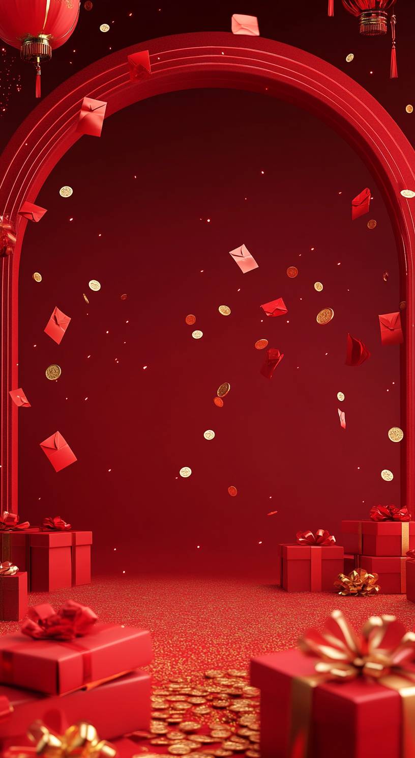 Red background, New Year atmosphere background with red envelopes and gold coins floating in the air. There is an arch at the bottom of the screen surrounded by stacked gift boxes. There's a large empty space at the top for text. The overall color scheme should be dark red and gold tones. It has Chinese elements such as fireworks and firecrackers, with a minimalist style. High-definition photography, bright colors, high resolution, and detailed details in the style of realist , Chinese New Year theme. --ar 21:38 --v 6.1