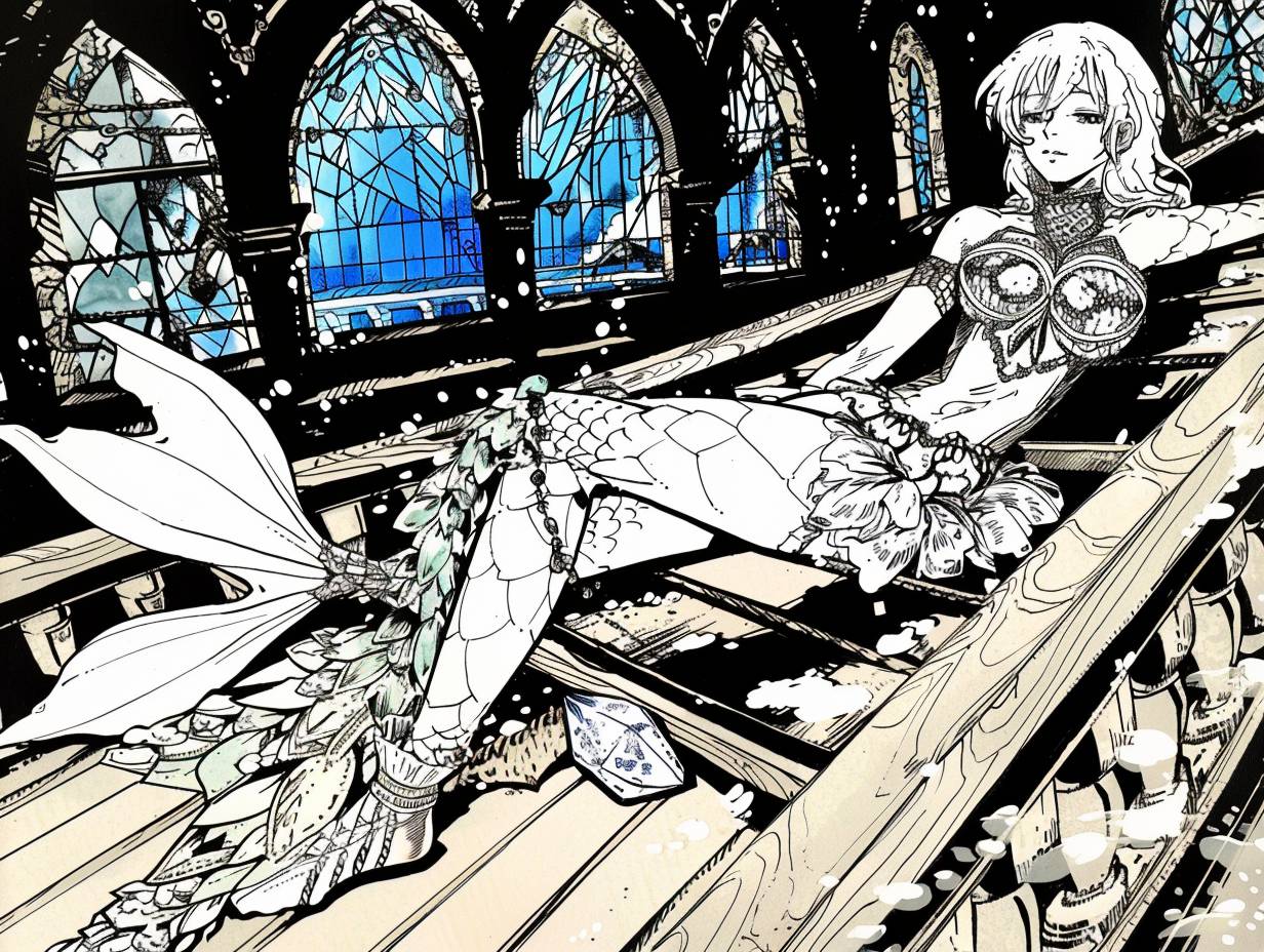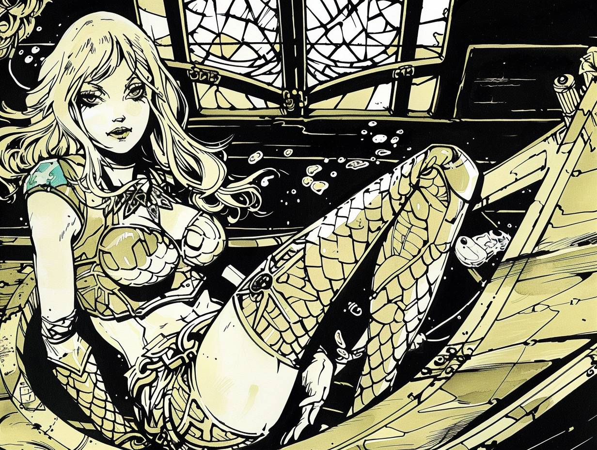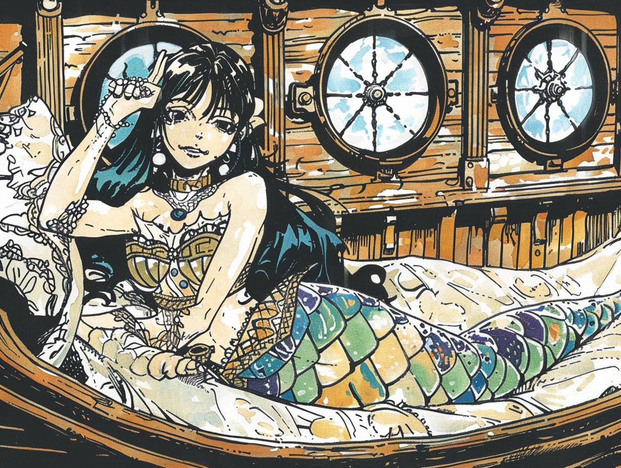 Una hermosa sirena reclinada en el asiento de un yate de madera con una ventana de vidrio marino.