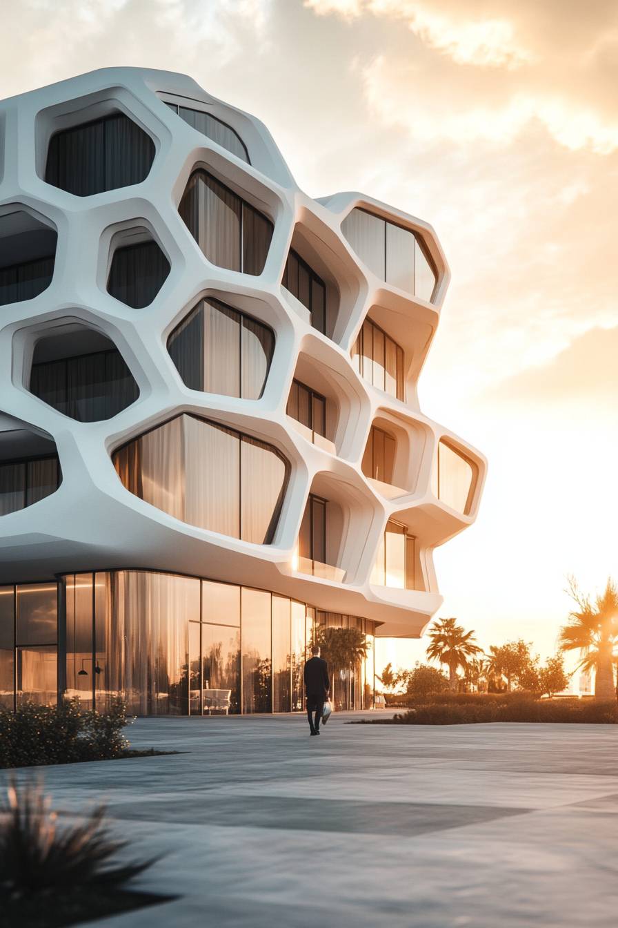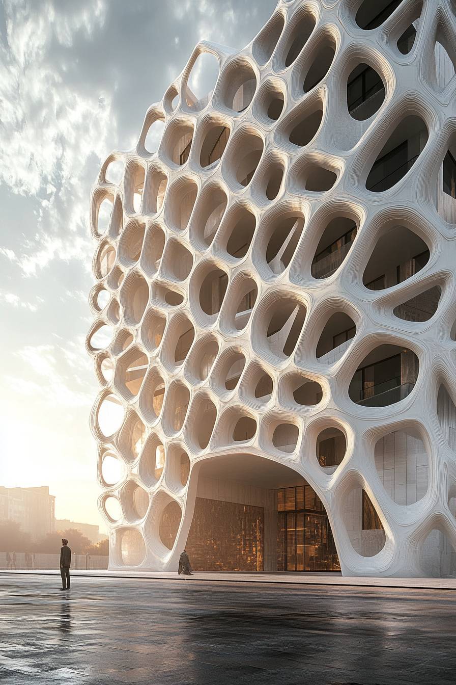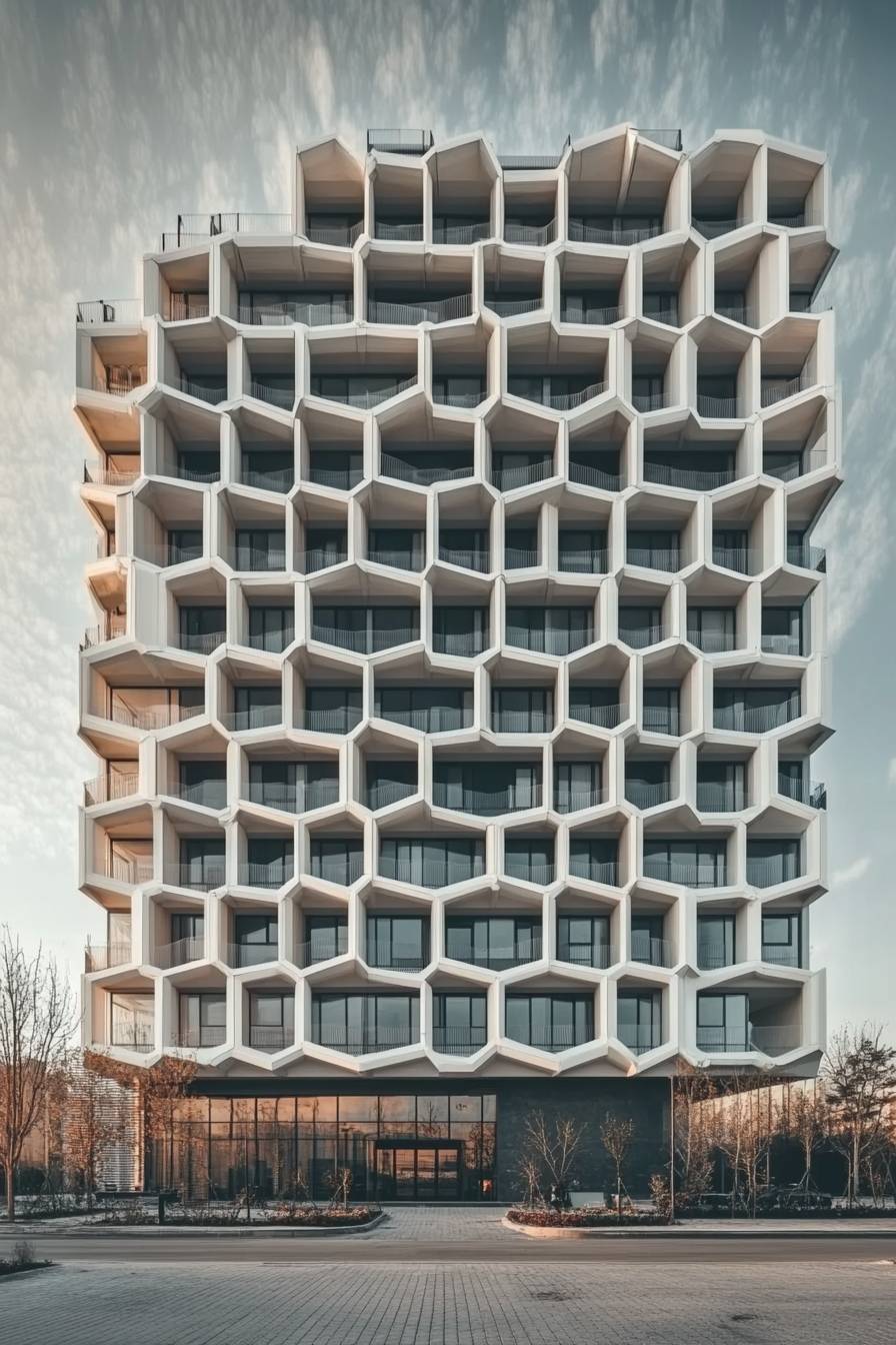 A front human eye level view of a modern 10 storey residential building with large honey comb facade in an urban setting, smooth white facade, MIR Architectural Rendering, Architecture Photography, Cinematic Photography, god rays --ar 2:3 --style raw --v 6.1