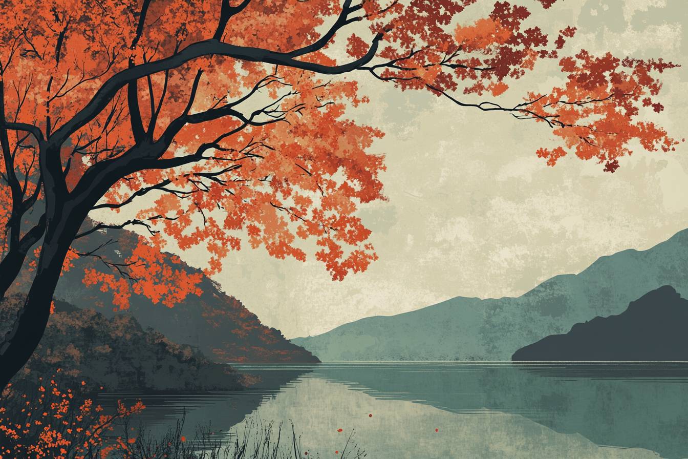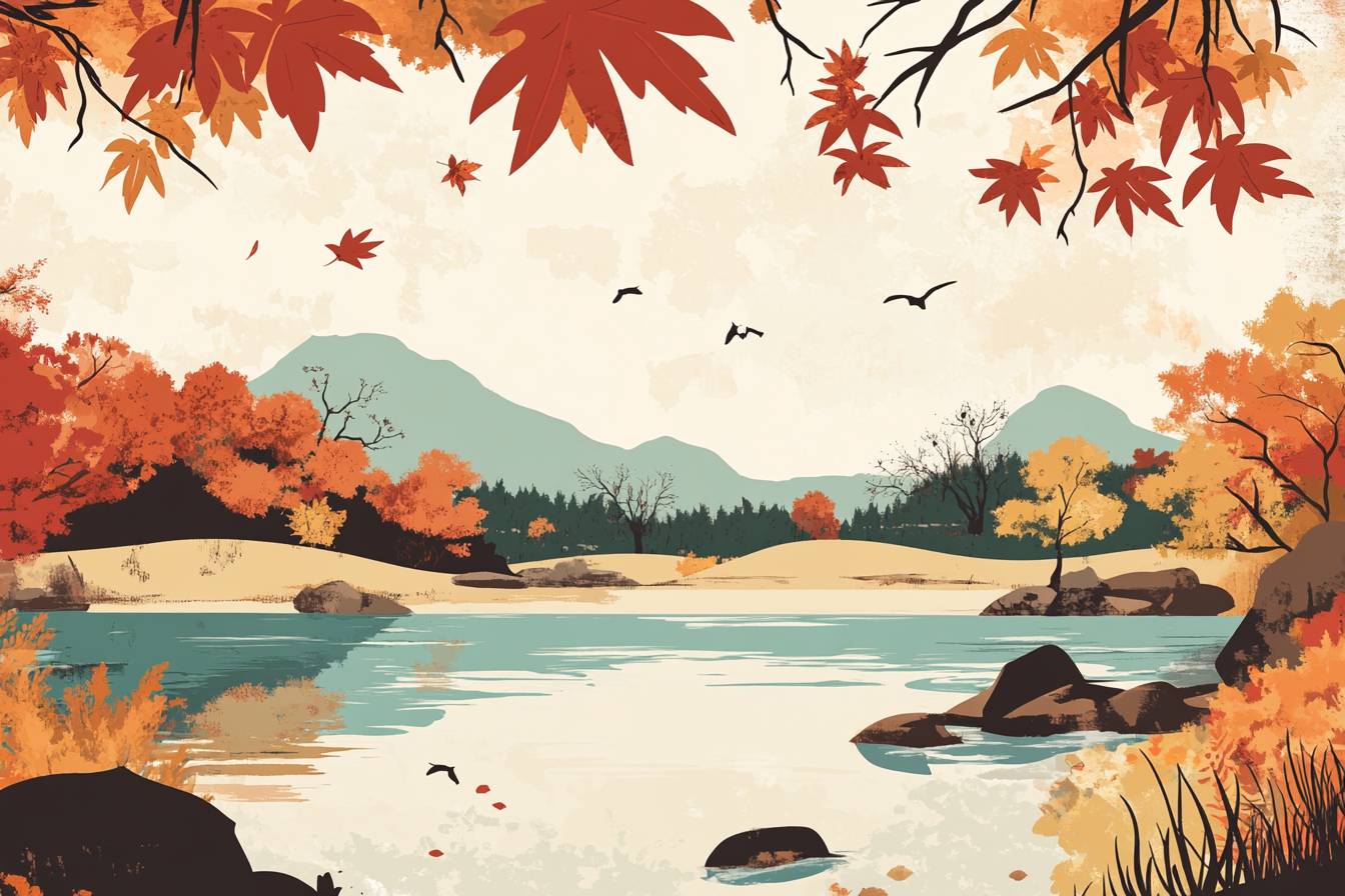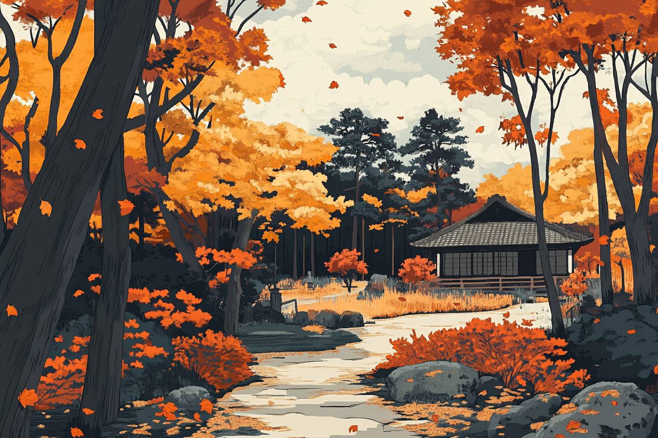 Reimaginado como una impresión en madera Ukiyo-e otoñal, con contornos audaces y áreas de color plano que representan un sereno paisaje de otoño. Utiliza colores ricos para representar las hojas cambiantes y el aire fresco de otoño.