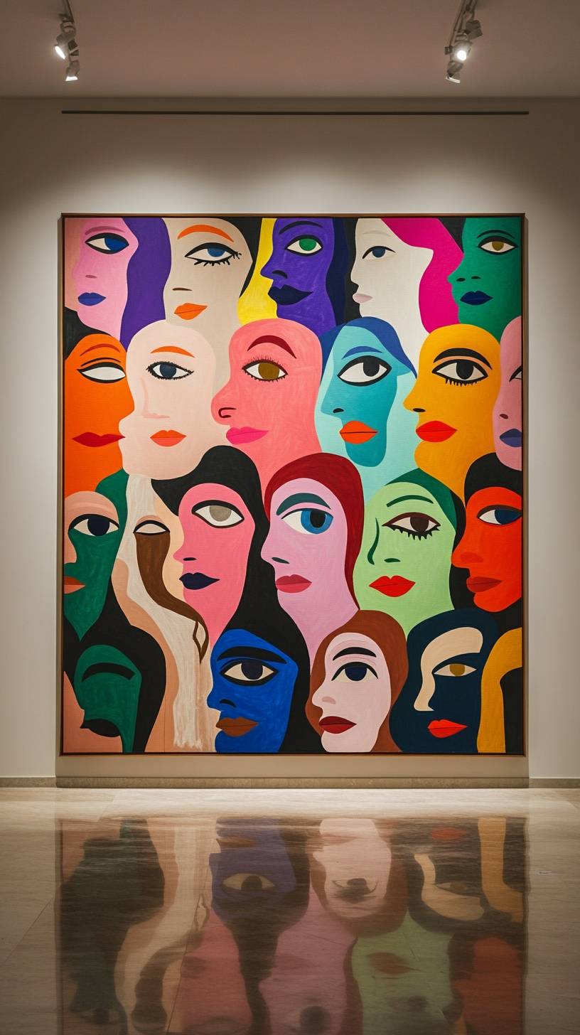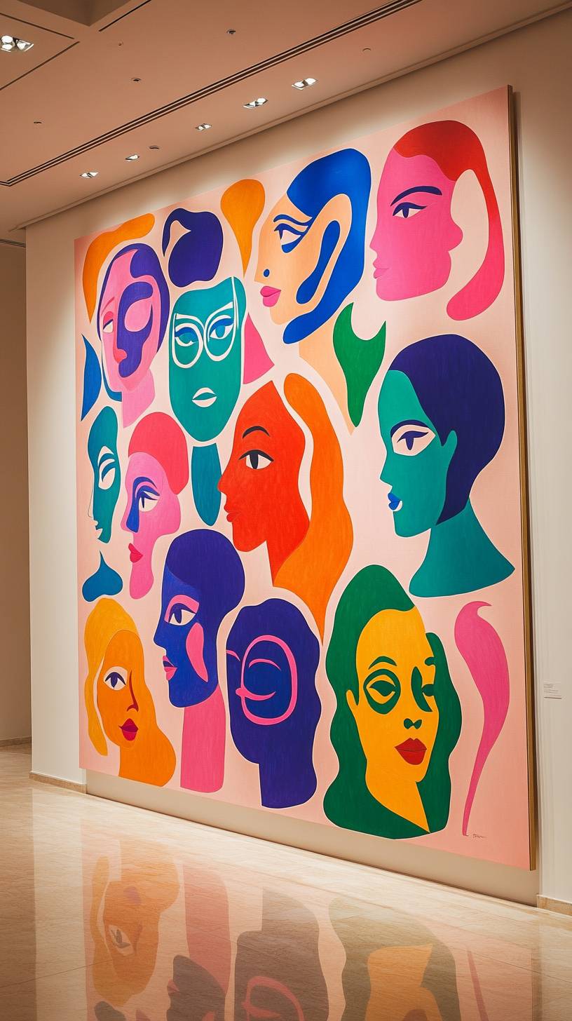 Una gran obra de arte con rostros coloridos exhibida en una galería.