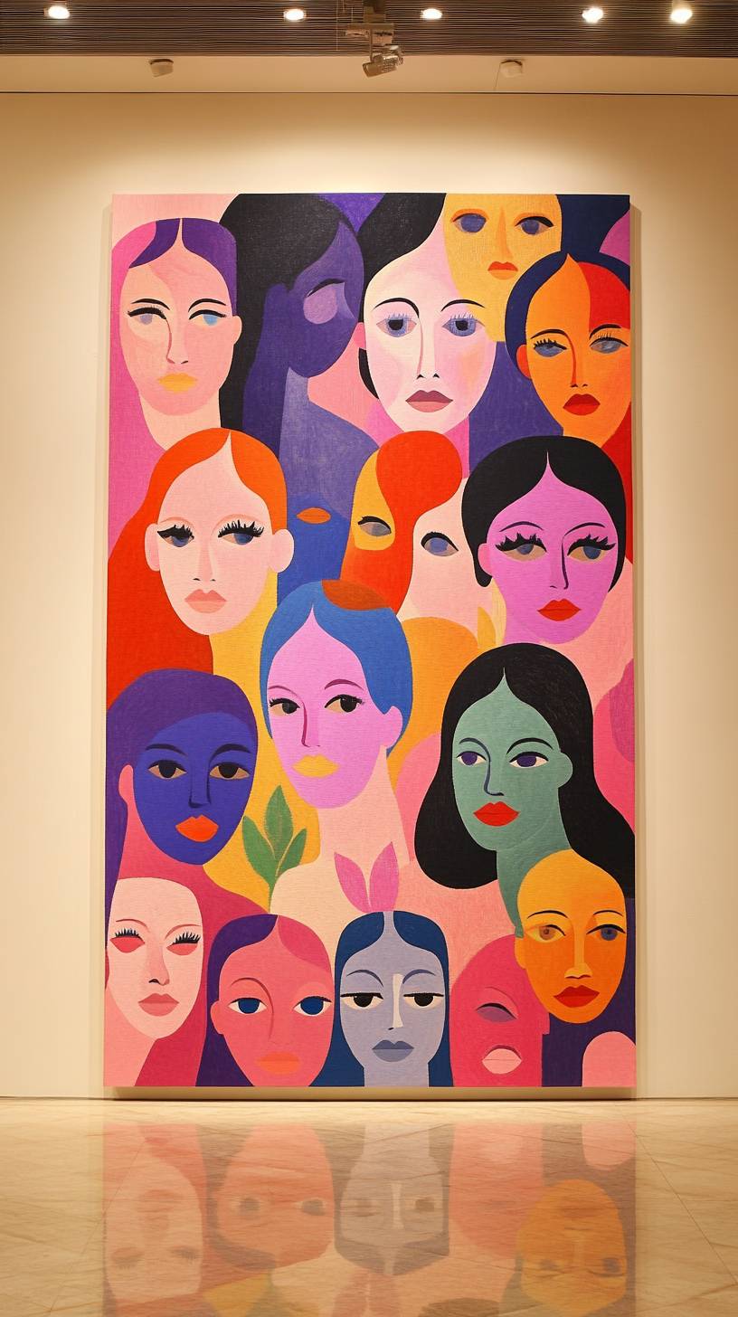 A large wall hanging with many faces in various colors and styles, all female or male heads, painted by Matisse in the style of Henri martell. The painting is on display inside an art gallery, illuminated from above. It has a light pink background color and there's a shadow cast over it. --ar 9:16 --stylize 250 --v 6.1