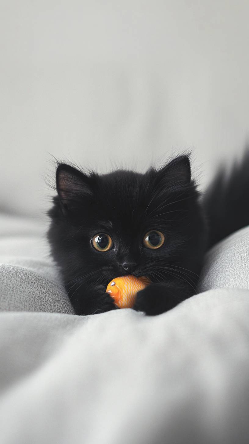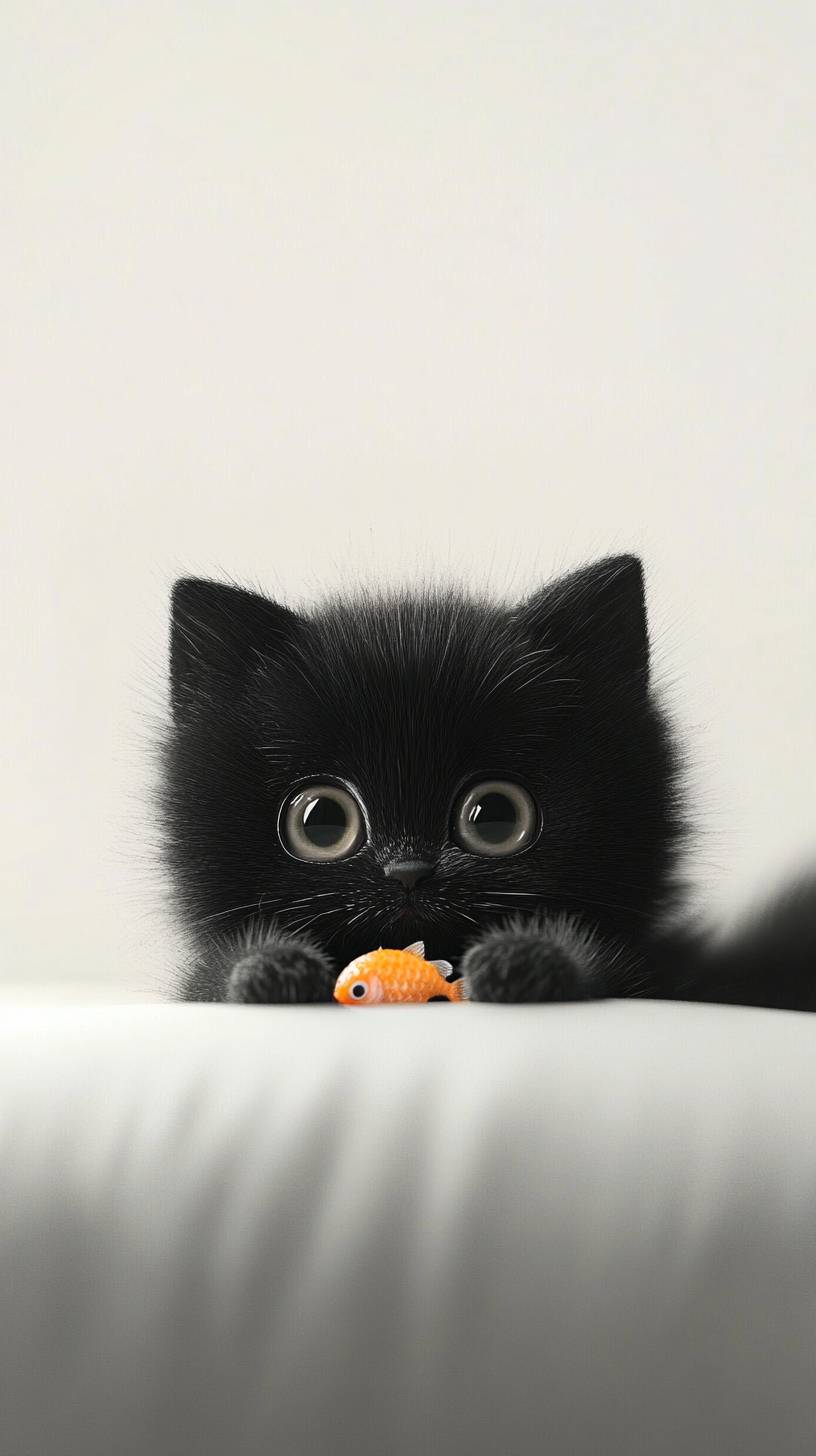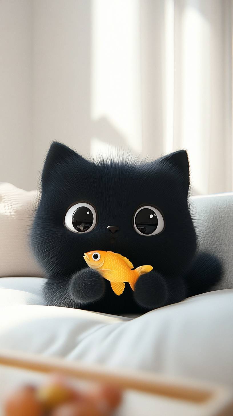 El pequeño gato negro, esponjoso y gordito, yace en el sofá, sosteniendo juguetonamente un pequeño bocadillo de pescado. El simple fondo blanco irradia elegancia, y el estilo de cartoon en 3D hace que el personaje parezca dinámico y adorable. La composición minimalista resalta la ternura y la comodidad del gato.