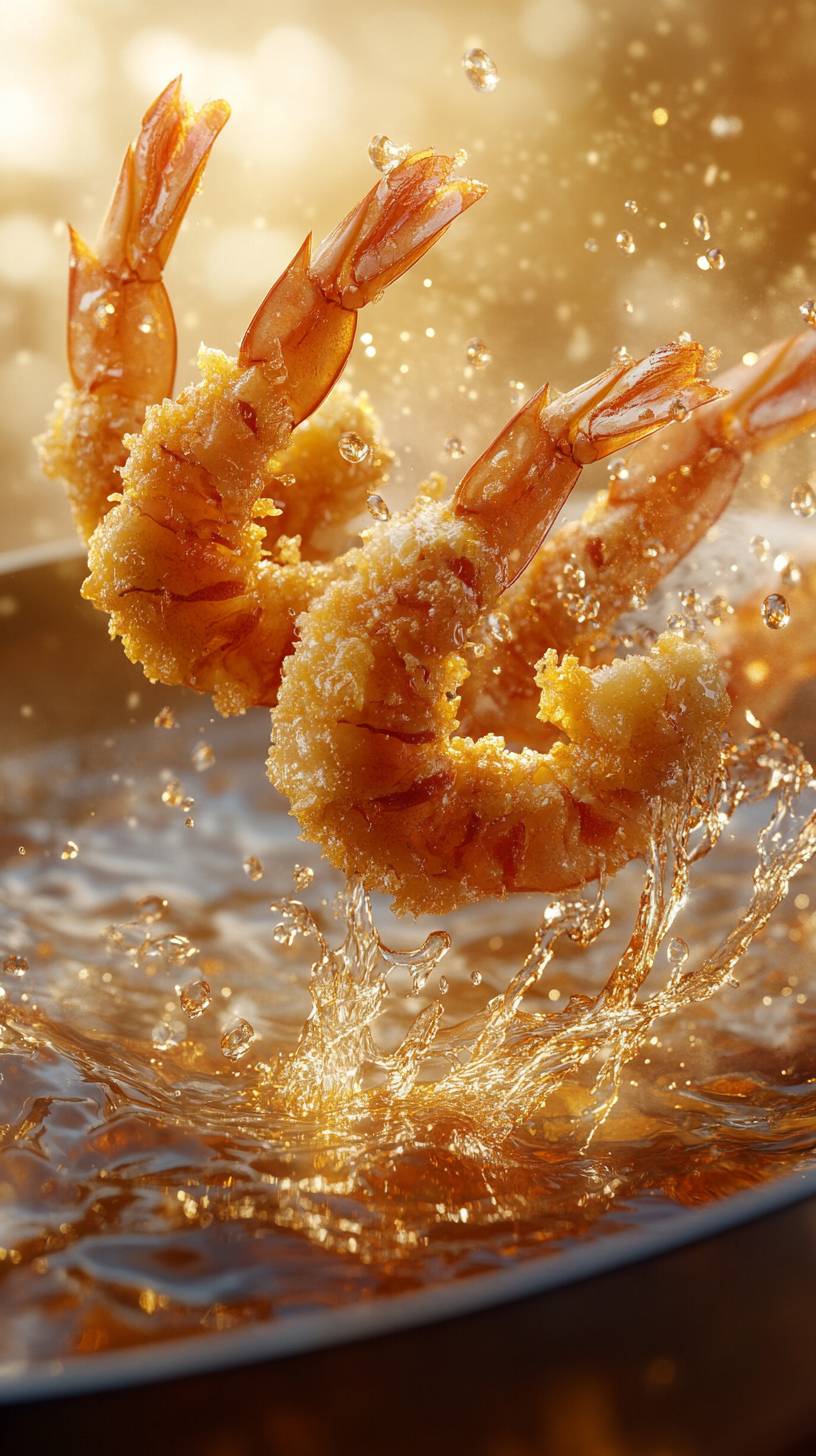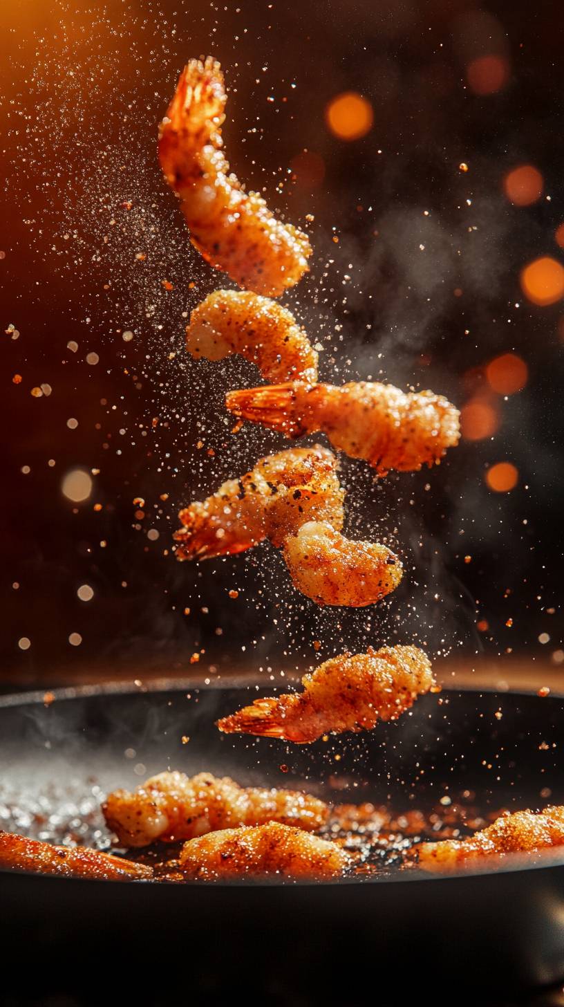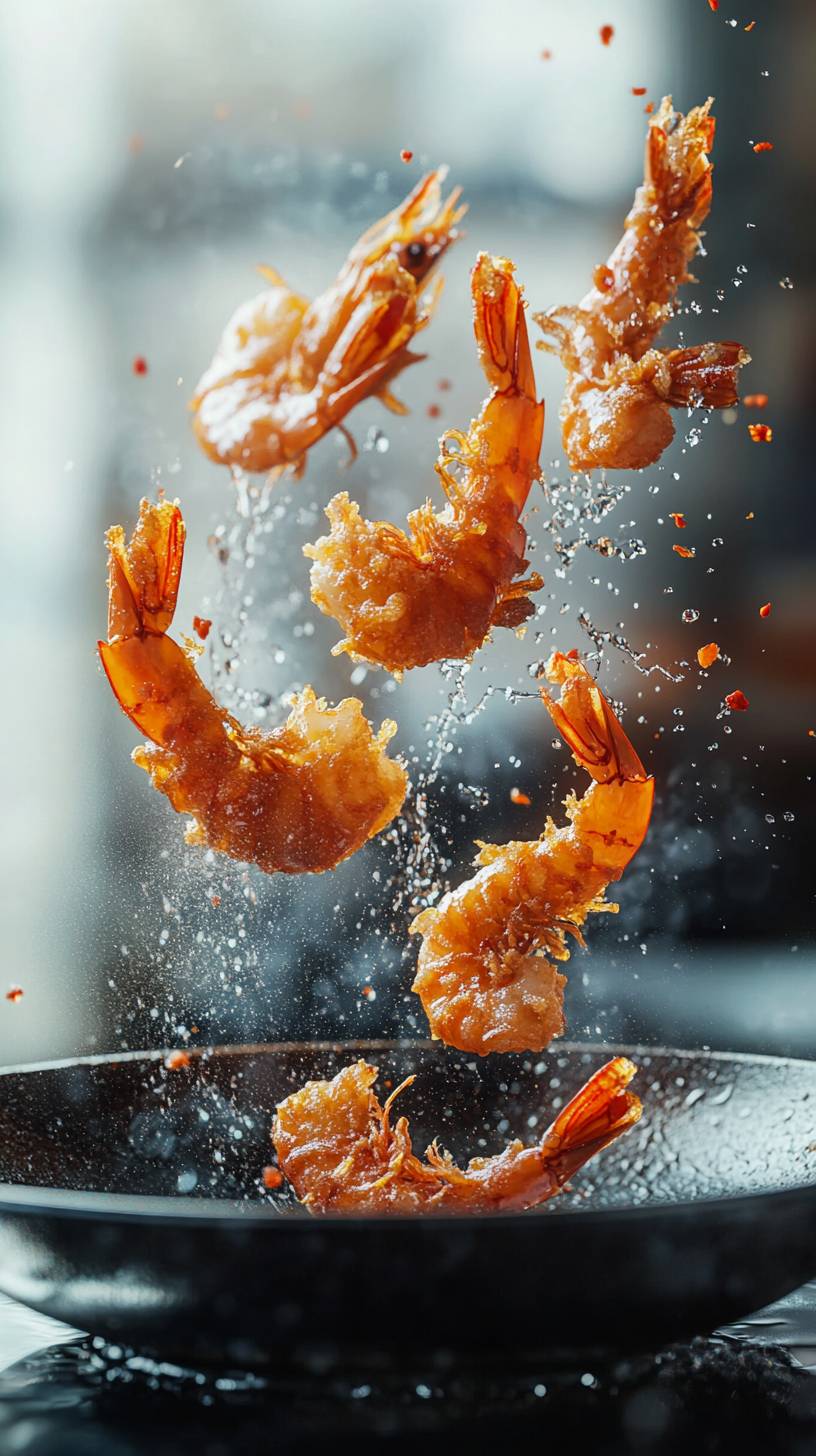 A stunning action shot of golden-brown fried prawns leaping from a sizzling frying pan, captured mid-air in a dramatic, coiling wave formation. The image is from an eye-level worm's-eye perspective, emphasizing the dynamic motion and making the prawns appear larger than life. Each prawn is perfectly crispy, with glistening textures and subtle charred edges, while tiny droplets of oil and seasoning scatter artistically in the air. The background is light and softly blurred, with warm tones hinting at a cozy kitchen ambiance. The frying pan below is sleek and detailed, with hints of sizzling oil and steam adding realism. The image exudes vibrancy, deliciousness, and a sense of culinary artistry, perfect for a high-impact advertisement, 8k, --ar 9:16 --v 6.1