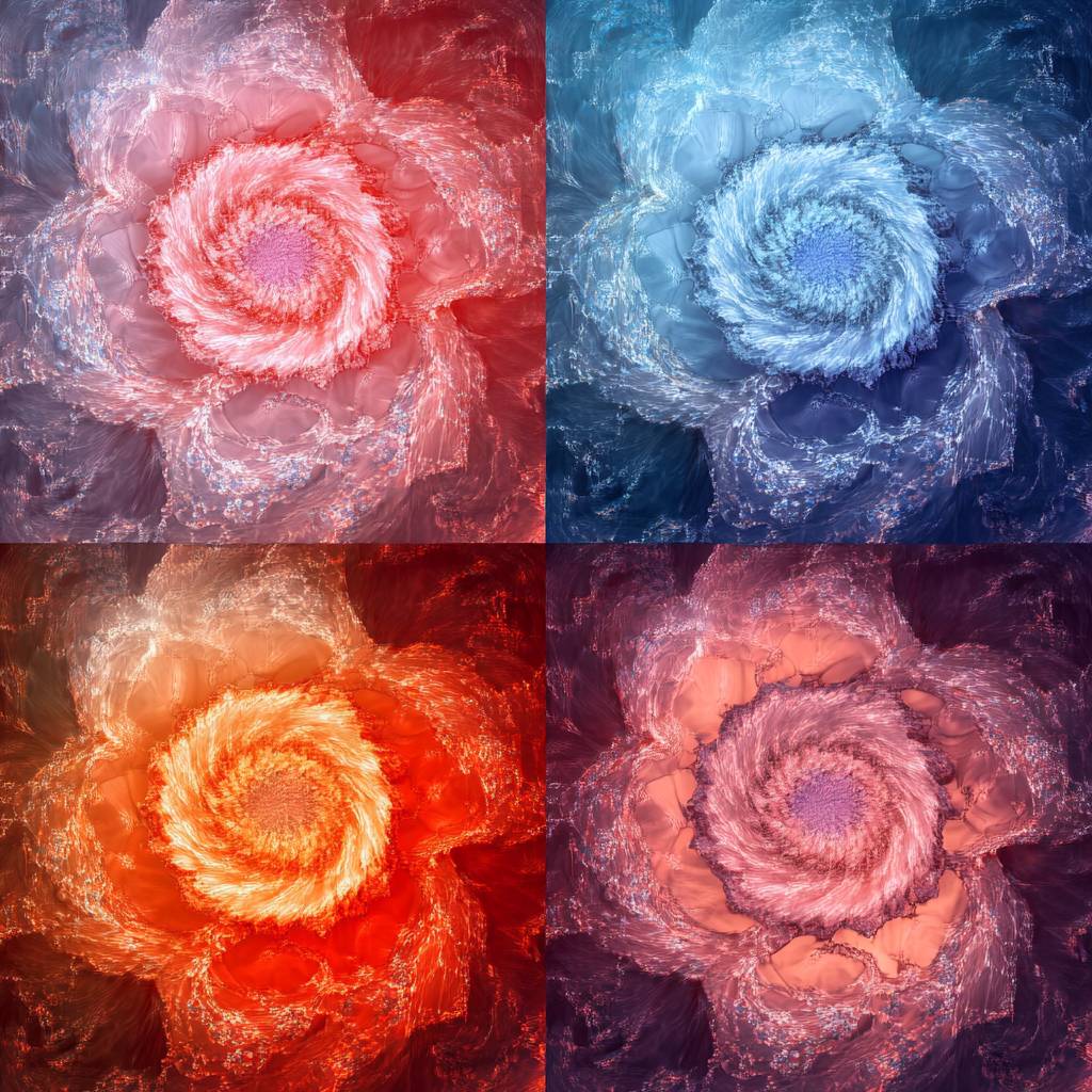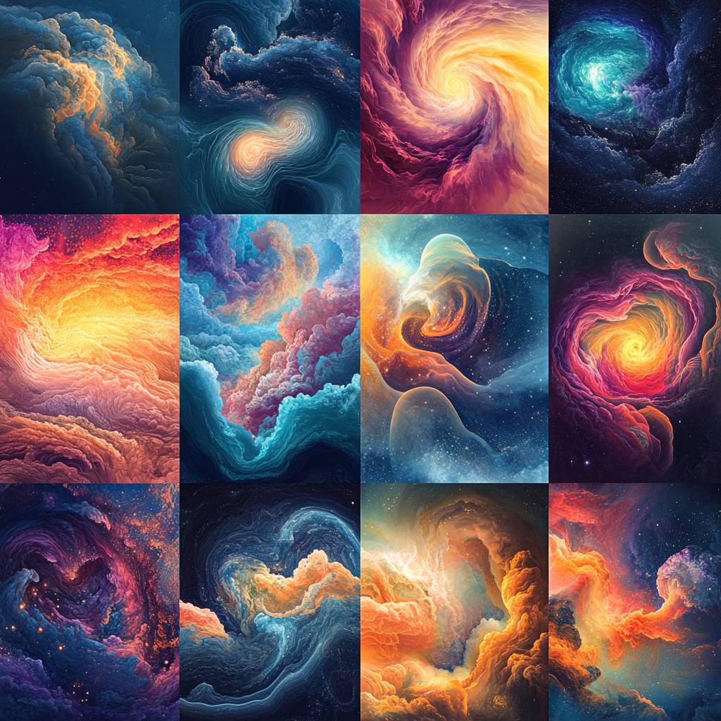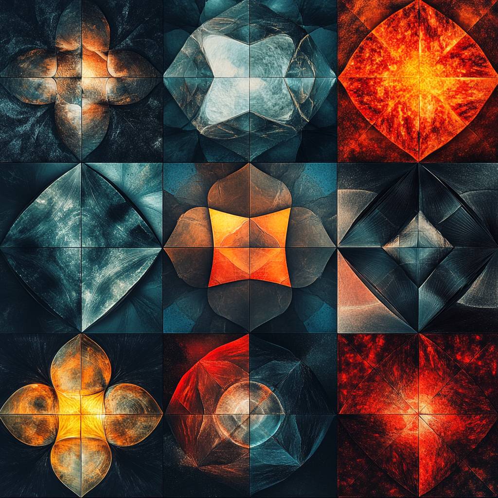 Crea una cuadrícula de publicación de Instagram 4x4 que muestre diferentes estilos de estética fractal.
