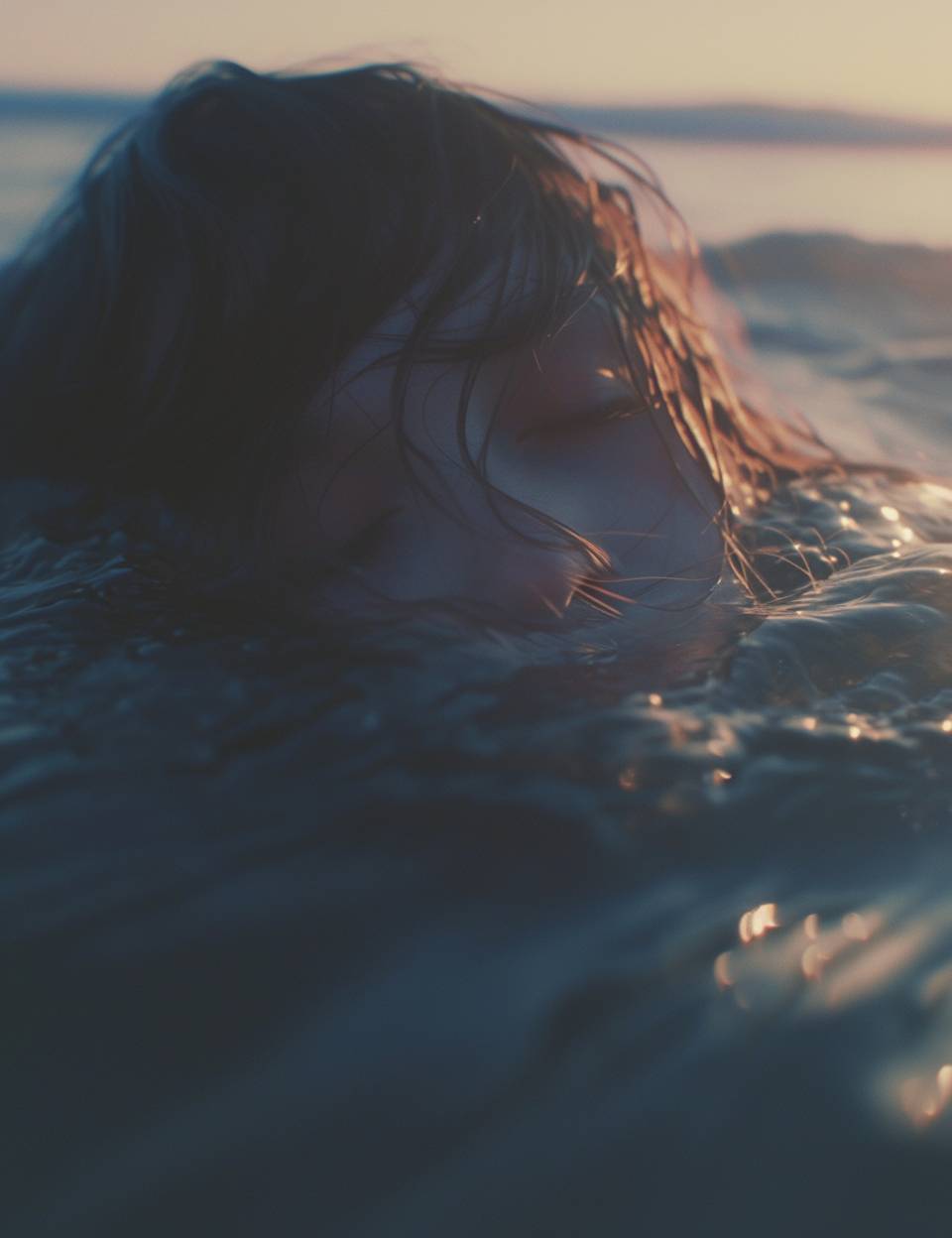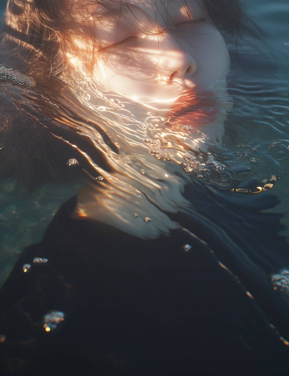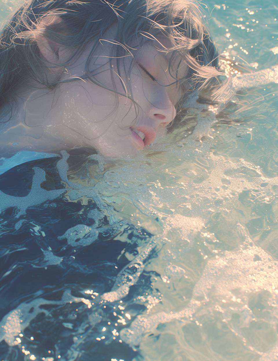 Waterline Gaze, Wide Angle, Shot on Hasselblad X1D, The image captures a woman as she floats, her eyes closed, with half her face submerged. The tilt-shift lens blurs the boundaries of water and air, focusing on where the water gently laps at her skin and where her hair floats away, mingling with the ripples of the sea. foreshortened view. --style raw --ar 17:22 --niji 6 --s 500