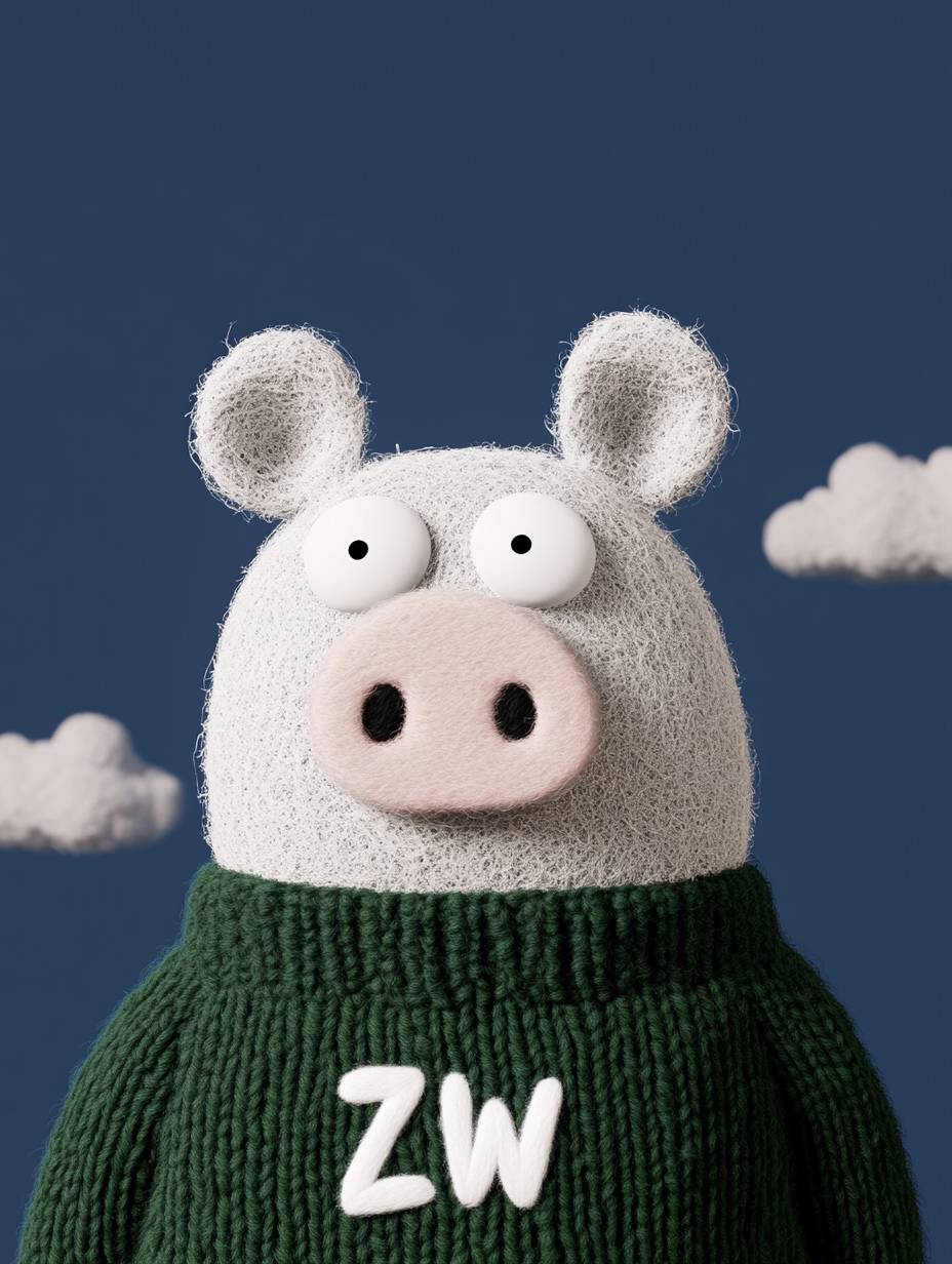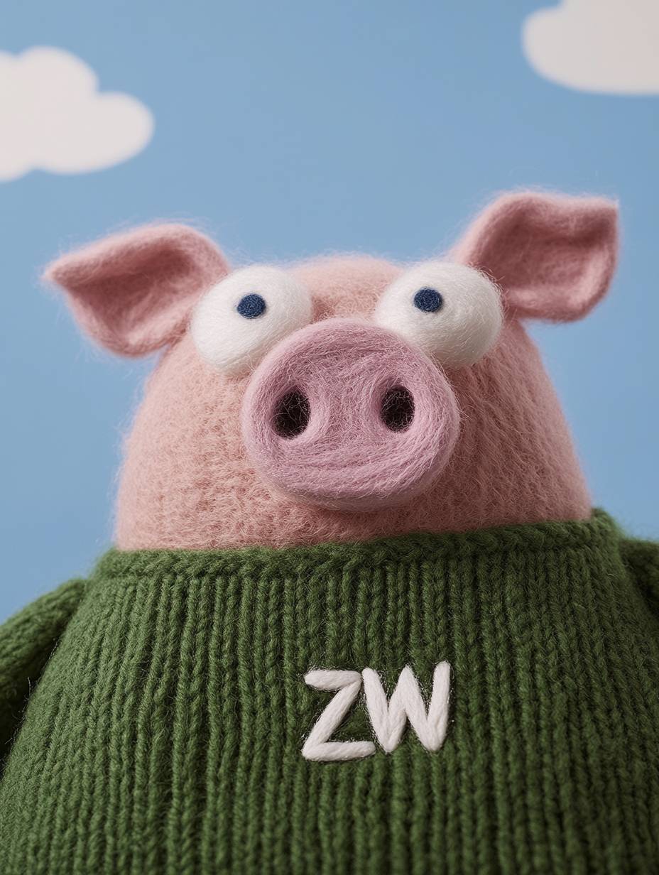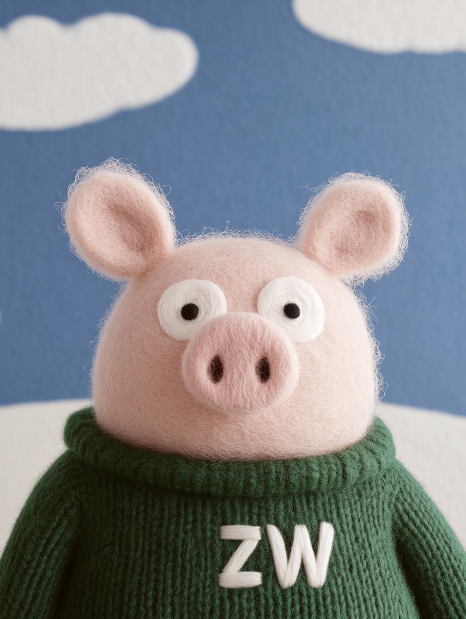 A close-up of a pig's head and shoulders, with big white eyes, made of felt material, wearing a green sweater, woven in roving, with the letter "ZW" on its chest and a blue sky and white clouds in the background, this high-quality illustration captures the cuteness and playfulness of Miffy's world --ar 3:4 --style raw --profile kzilt9y --stylize 1000 --v 6.1