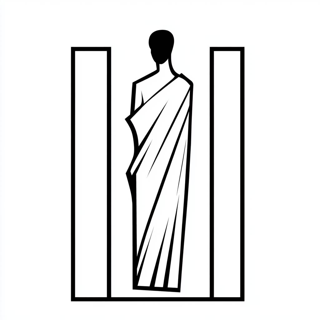 Tres rectángulos verticales en línea negra, perfectamente alineados en un fondo blanco, cada uno ligeramente ensanchado en la parte superior para evocar simples gorras. Una silueta humana de frente, trazada con una sola línea fluida, se encuentra frente a ellos, ligeramente inclinada como si estuviera mirando hacia arriba. La toga se indica con una sola línea diagonal a través del cuerpo, y todos los elementos dependen de líneas meticulosamente elaboradas de igual grosor, manteniendo un estilo completamente minimalista.