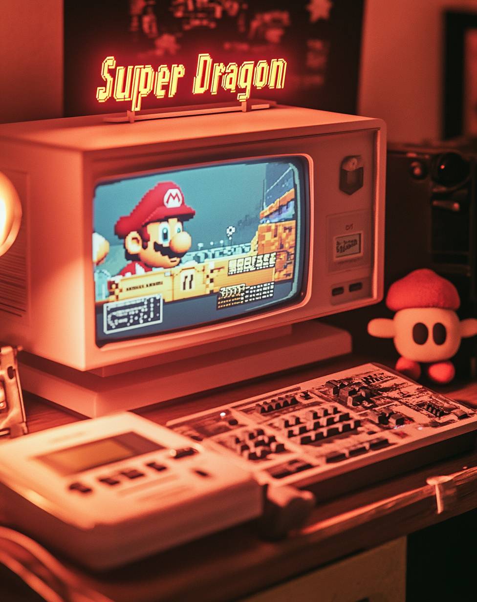 Una consola de juegos retro etiquetada como 'Super Dragon' con una interfaz que recuerda a Super Mario Bros.