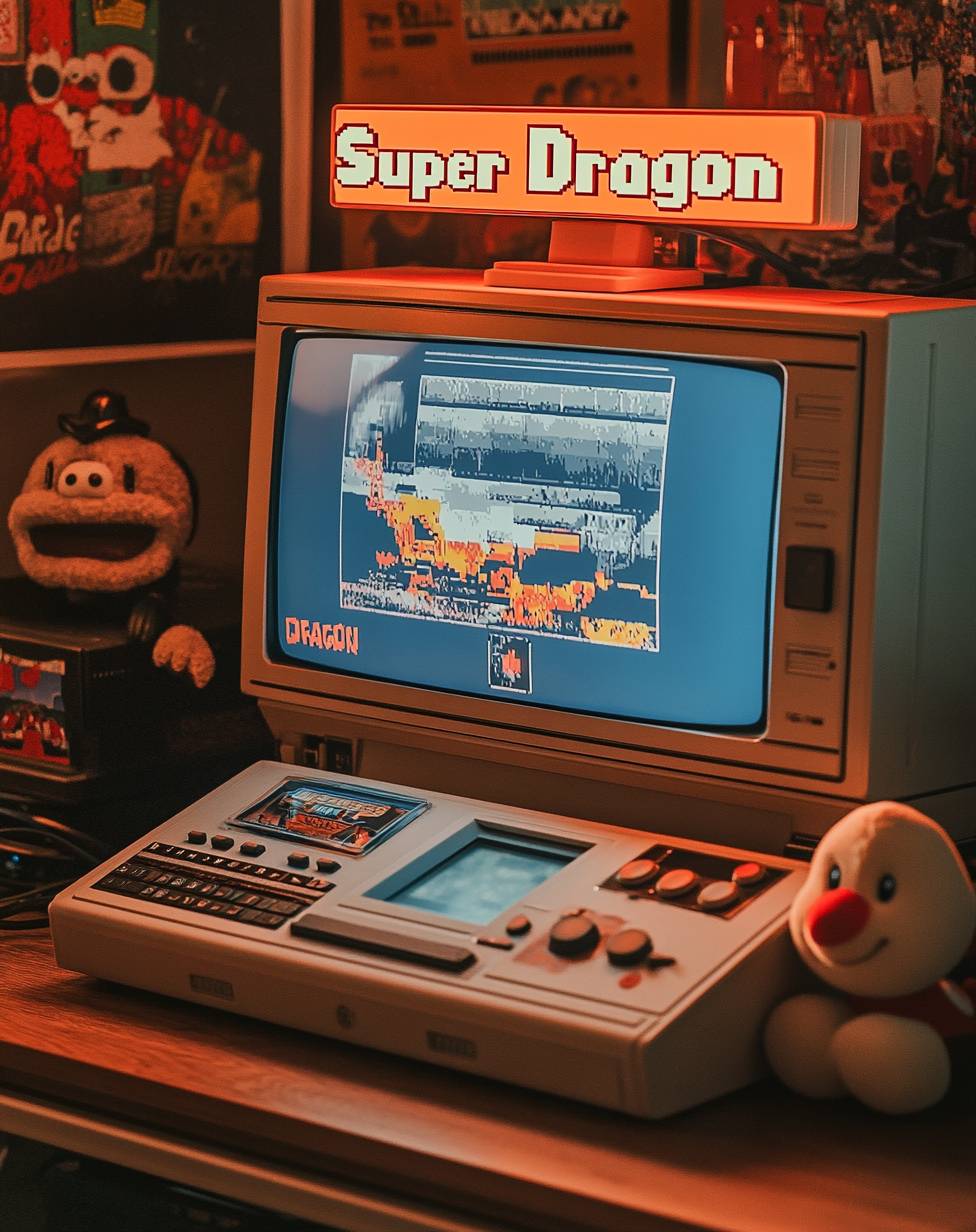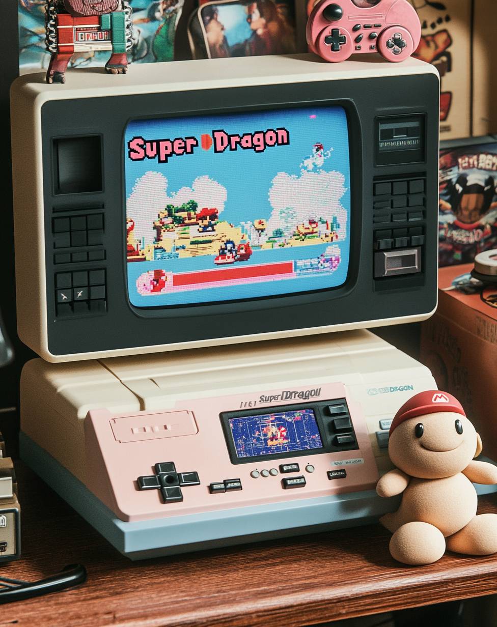 Una consola de videojuegos retro con 'Super Dragon' en la parte superior, que presenta una interfaz que recuerda a Super Mario Bros. y varios botones de control. La pantalla muestra gráficos en pixel art de videojuegos clásicos, como una escena del juego de Wario o un reloj de timelapse al estilo de Diego, junto con algunos carteles de la vieja escuela. También es visible un monitor de computadora de escritorio que muestra números digitales que indican el progreso del juego. Incluye una figura de peluche corta de un personaje de Nintendo colocada a su lado.