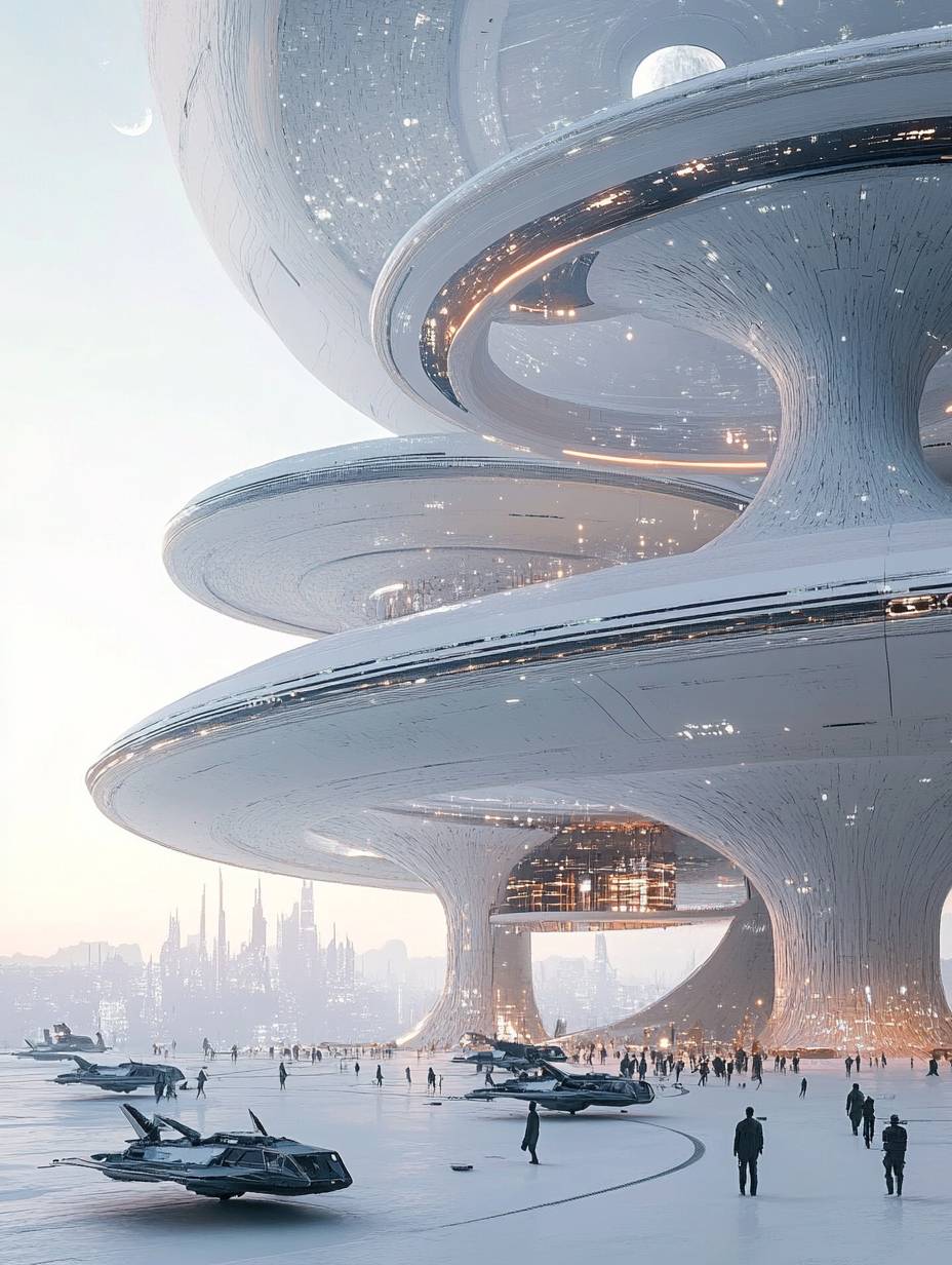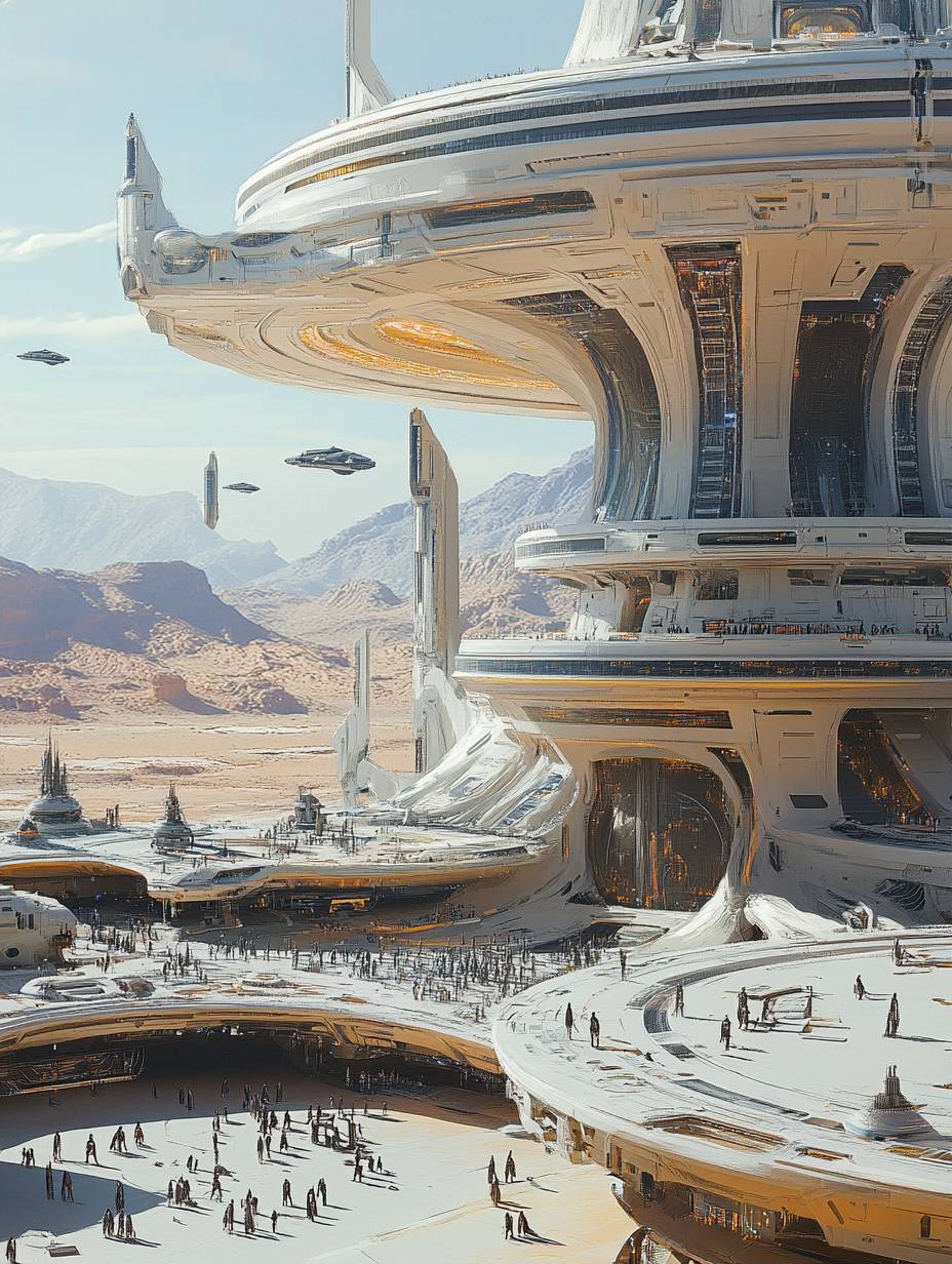 A massive circular space station with multiple levels and a large ringed hanger, some small ships parked outside the main structure. People walking around in futuristic , concept art in the style of Ross Tran, sci-fi. --ar 3:4 --v 6.1 --style raw