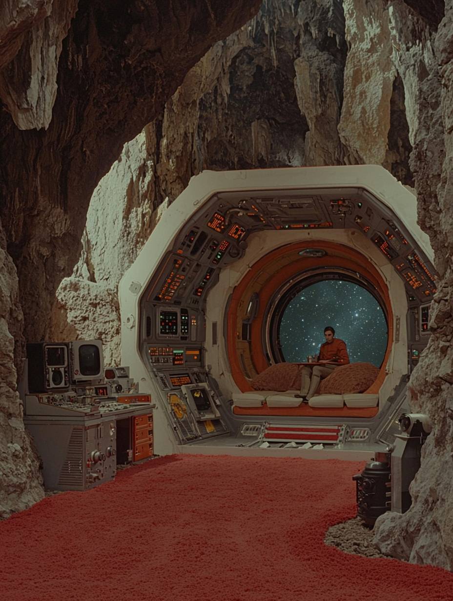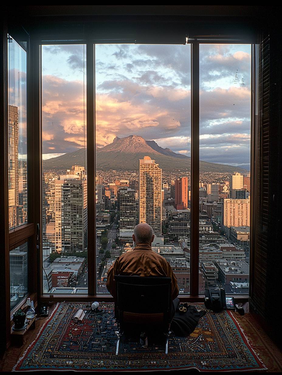 Una escena de una película de ciencia ficción de 1988 con una oficina futurista, una persona bebiendo café y una hermosa vista matutina.