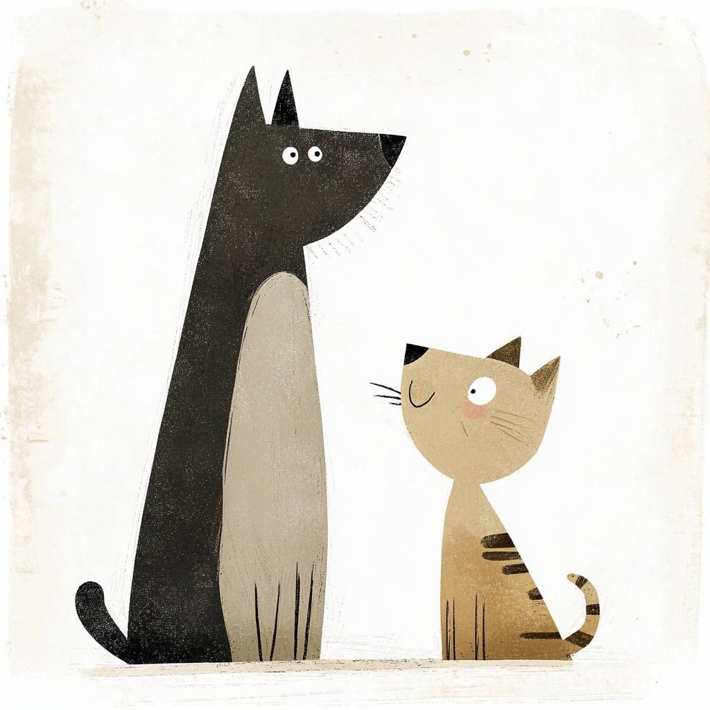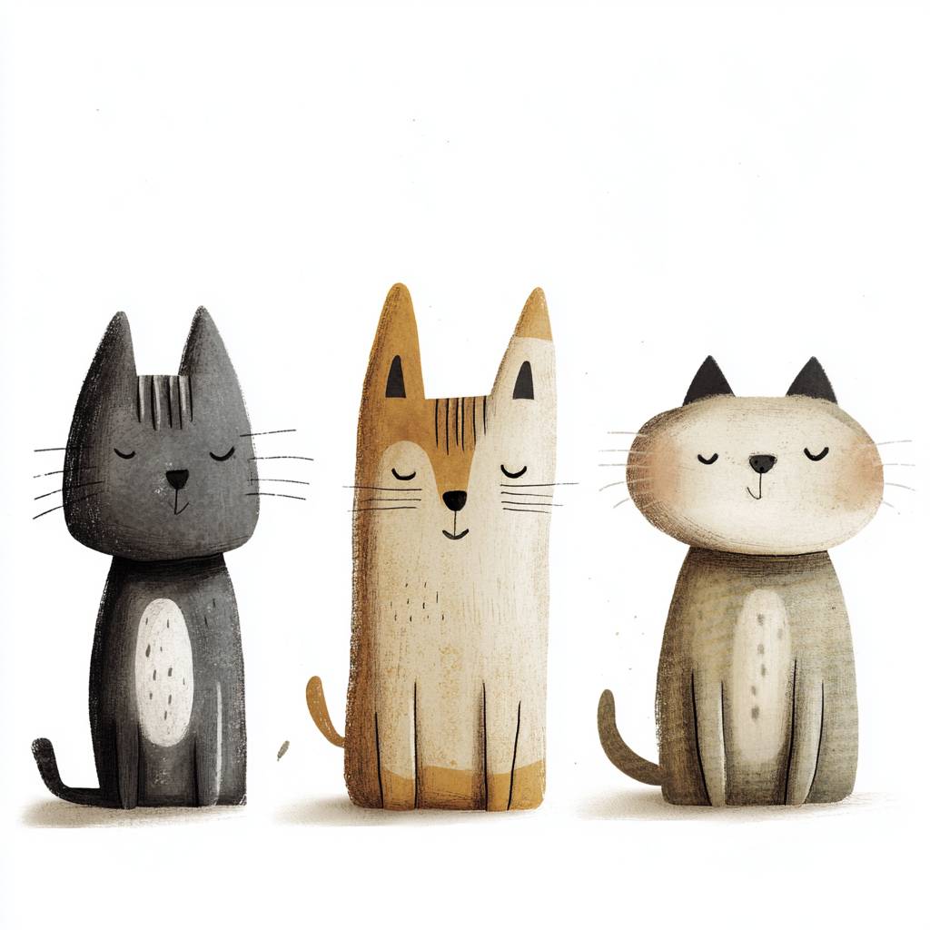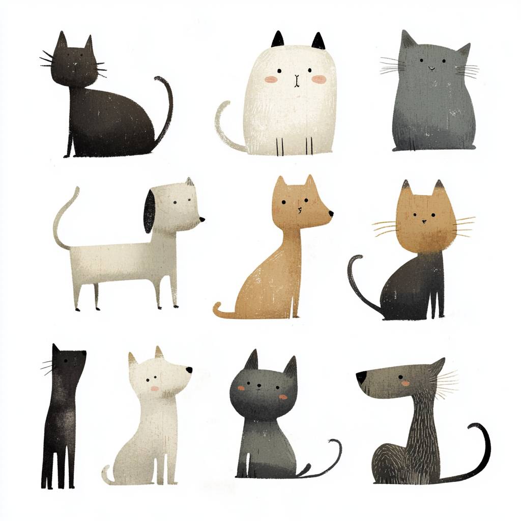 Animales lindos, perros y gatos, sobre un fondo blanco, al estilo de Jon Klassen.