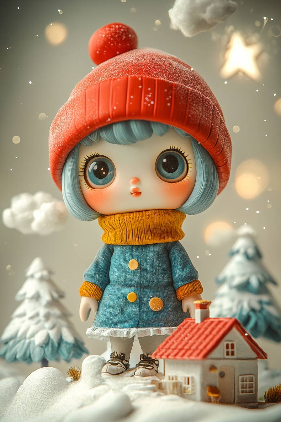 La imagen presenta una linda muñeca 3D de caja ciega con un sombrero rojo y ropa azul sentada sobre una pequeña casa, creando una atmósfera mágica y infantil.