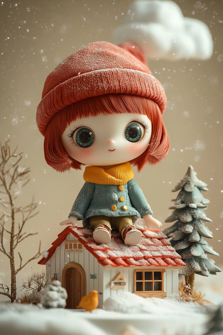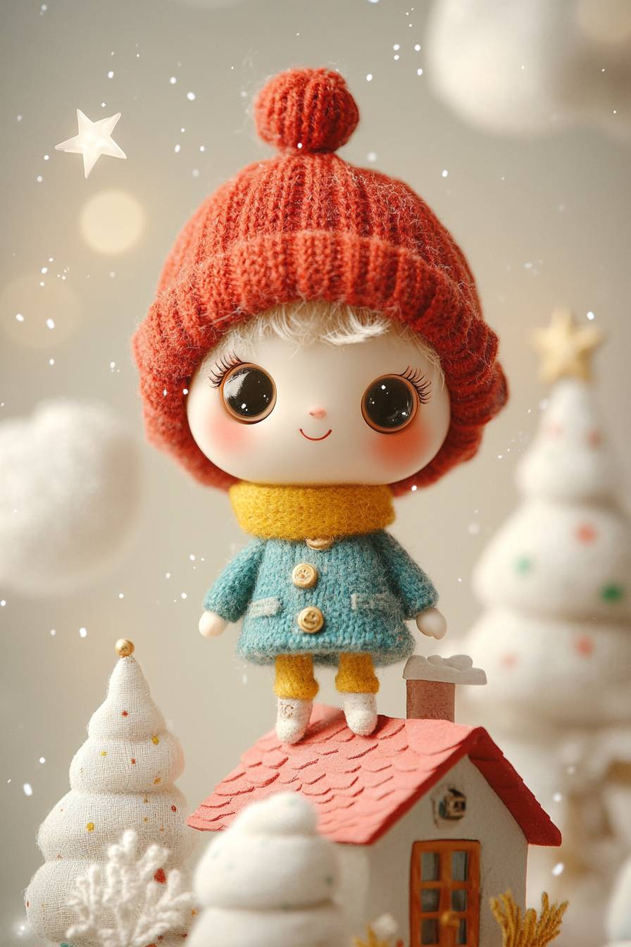 This is an image filled with childlike wonder and dreamy colors, featuring a cute 3D blind box doll. The doll wears a red hat and blue clothes with a yellow collar, and its large eyes radiate innocence and purity, creating an overall rounded and adorable appearance. The doll is sitting on top of a small house, which has a red roof and white walls, surrounded by a few uniquely shaped little trees that enhance the liveliness of the scene. The background is a soft beige, dotted with white clouds and a star, along with a gray cloud, creating a tranquil and beautiful atmosphere, as if it belongs to a fairytale world. --v 6.1 --ar 2:3 --s 250