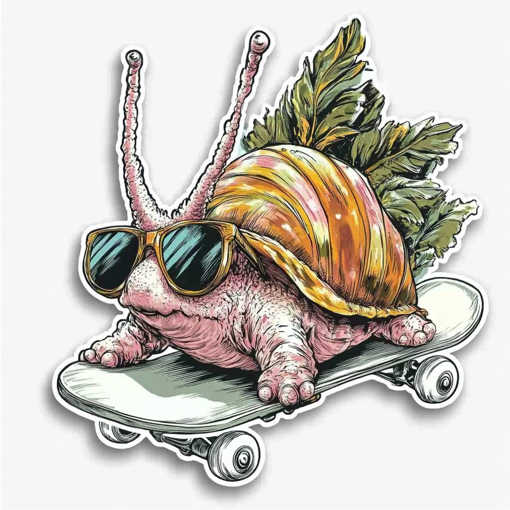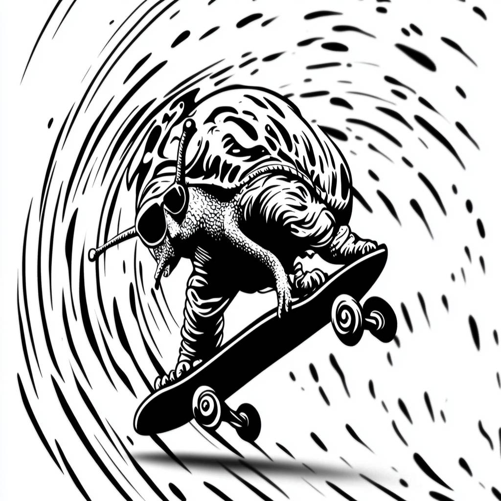 Icono en blanco y negro: un caracol en un monopatín con gafas de sol.