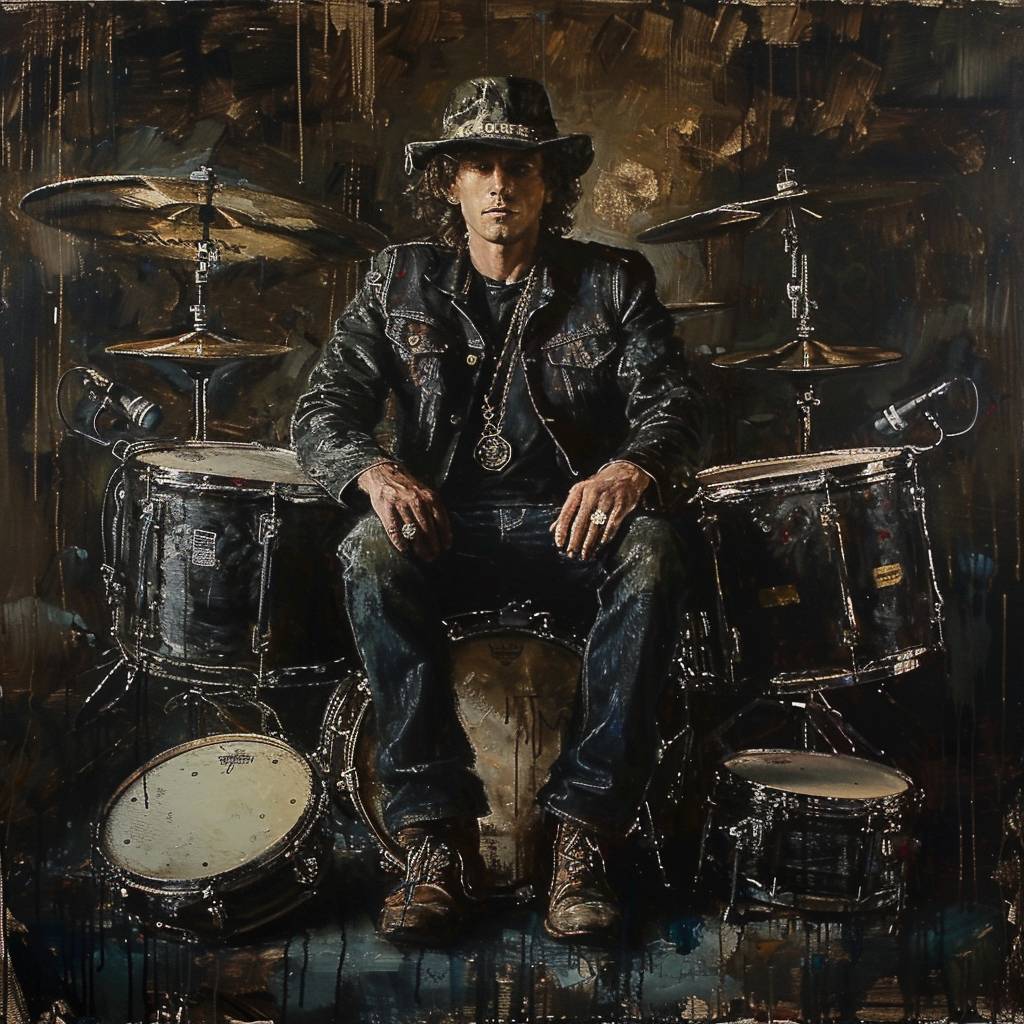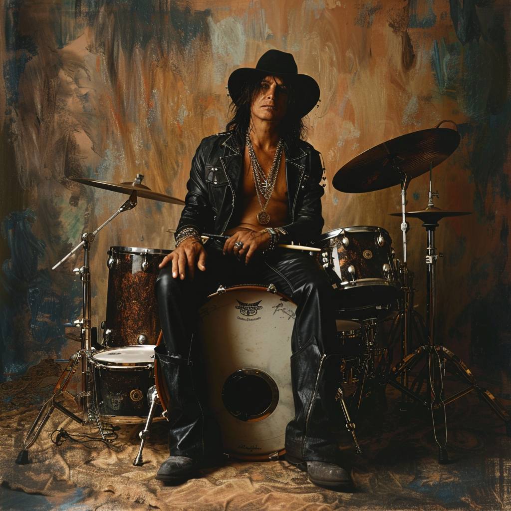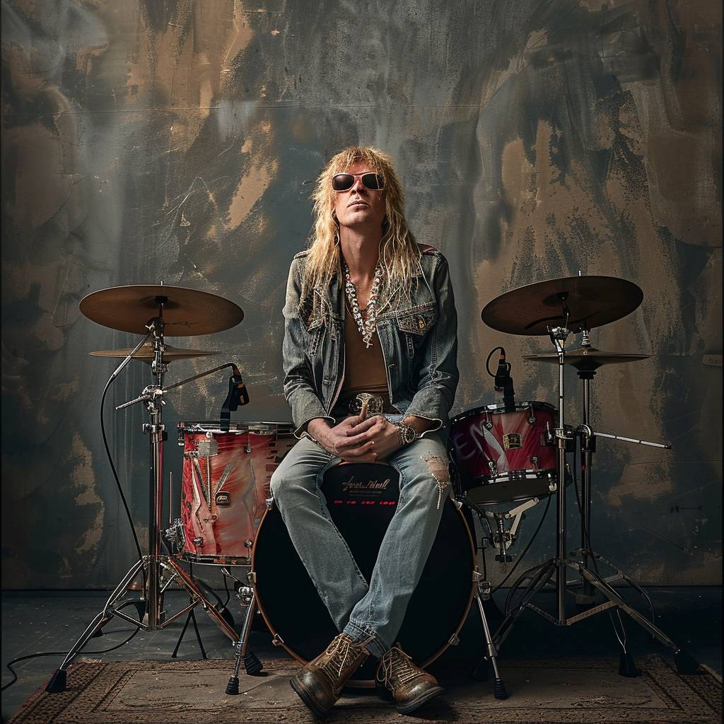Retrato de cuerpo completo de un famoso rockstar sentado sobre un montón de tambores