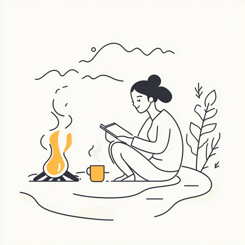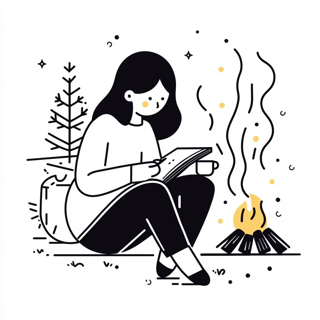 Create a minimalistic line art illustration using consistent 3-pixel black lines for all outlines, ensuring a clean, precise, and simple design. Depict a woman sitting by a campfire, writing in a notebook, with a coffee mug nearby. Her facial features should be minimal--small dots or short curved lines for eyes, a slight curve for a neutral or reflective expression, and no additional details such as wrinkles or nose lines. The character should have a smooth, round facial shape and balanced proportions. Clothing should be represented with basic shapes and clean lines, avoiding patterns, folds, or textures, and limited to simple outlines. Essential elements of the scene include: A notebook and pen in the woman’s hands. A campfire with a few smooth, simple logs beneath it. A steaming coffee mug placed beside her. A gently curved gravel road leading into the distance, subtly suggesting movement and exploration. Exclude detailed backgrounds, environmental textures, or shading--use only essential line-based elements to evoke a sense of stillness, curiosity, and reflection. Pastel accents in pale yellow, mint green, or light blue may be used sparingly on small details like the mug or subtle highlights on the fire to add warmth while preserving the minimalistic style. The woman should adopt a relaxed, introspective posture, seated near the fire, with one leg bent and the other stretched out--suggesting both rest and readiness for the next journey. The overall tone must be clean, thoughtful, and inviting, capturing the essence of wandering, wondering, and storytelling. --v 6.1