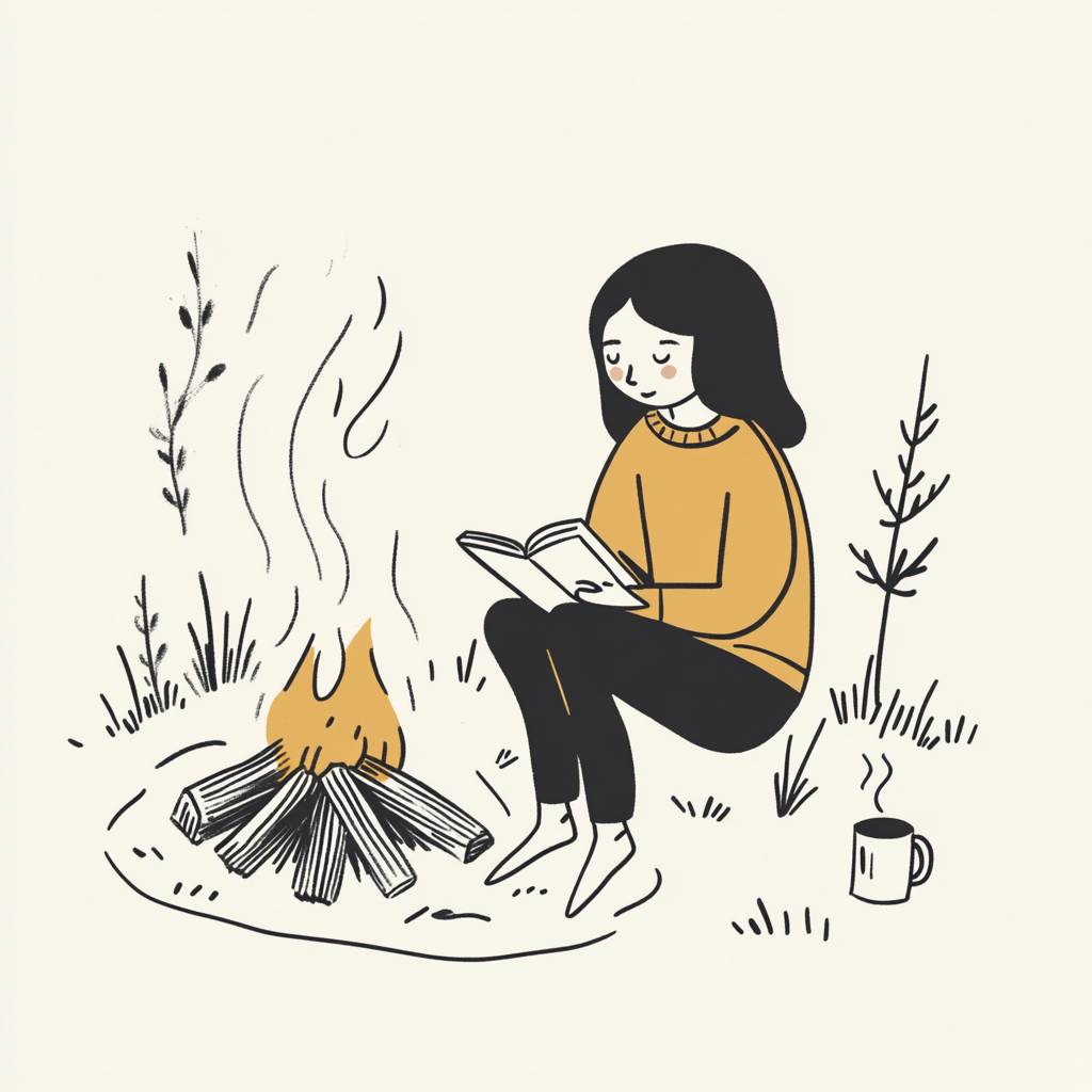 Crea una ilustración de arte lineal minimalista utilizando líneas negras consistentes de 3 píxeles para todos los contornos, asegurando un diseño limpio, preciso y simple. Representa a una mujer sentada junto a una fogata, escribiendo en un cuaderno, con una taza de café cerca. Sus rasgos faciales deben ser mínimos: puntos pequeños o líneas curvas cortas para los ojos, una ligera curva para una expresión neutral o reflexiva, y sin detalles adicionales como arrugas o líneas de la nariz. El personaje debe tener una forma facial suave y redonda y proporciones equilibradas. La ropa debe representarse con formas básicas y líneas limpias, evitando patrones, pliegues o texturas, y limitada a contornos simples. Elementos esenciales de la escena incluyen: un cuaderno y un bolígrafo en manos de la mujer; una fogata con algunos troncos suaves y simples debajo; una taza de café humeante colocada a su lado; un camino de grava suavemente curvado que se extiende hacia la distancia, sugiriendo sutilmente movimiento y exploración. Excluye antecedentes detallados, texturas ambientales o sombras; utiliza solo elementos basados en líneas esenciales para evocar una sensación de tranquilidad, curiosidad y reflexión. Pueden usarse acentos en colores pastel en amarillo pálido, verde menta o azul claro de manera esporádica en pequeños detalles como la taza o toques sutiles en el fuego para agregar calidez mientras se preserva el estilo minimalista. La mujer debe adoptar una postura relajada e introspectiva, sentada cerca del fuego, con una pierna doblada y la otra estirada, sugiriendo tanto descanso como disposición para el próximo viaje. El tono general debe ser limpio, reflexivo y acogedor, capturando la esencia de vagar, preguntarse y contar historias.
