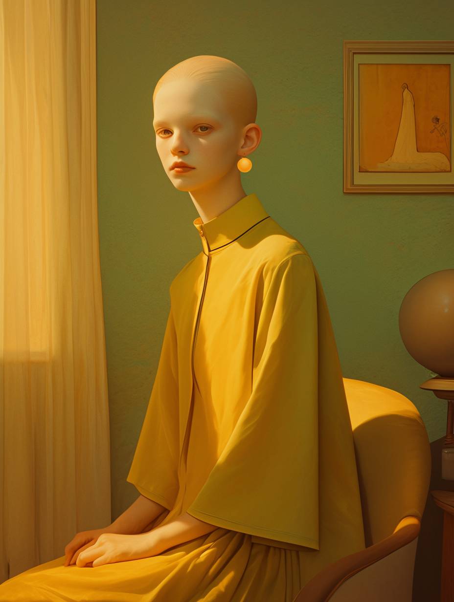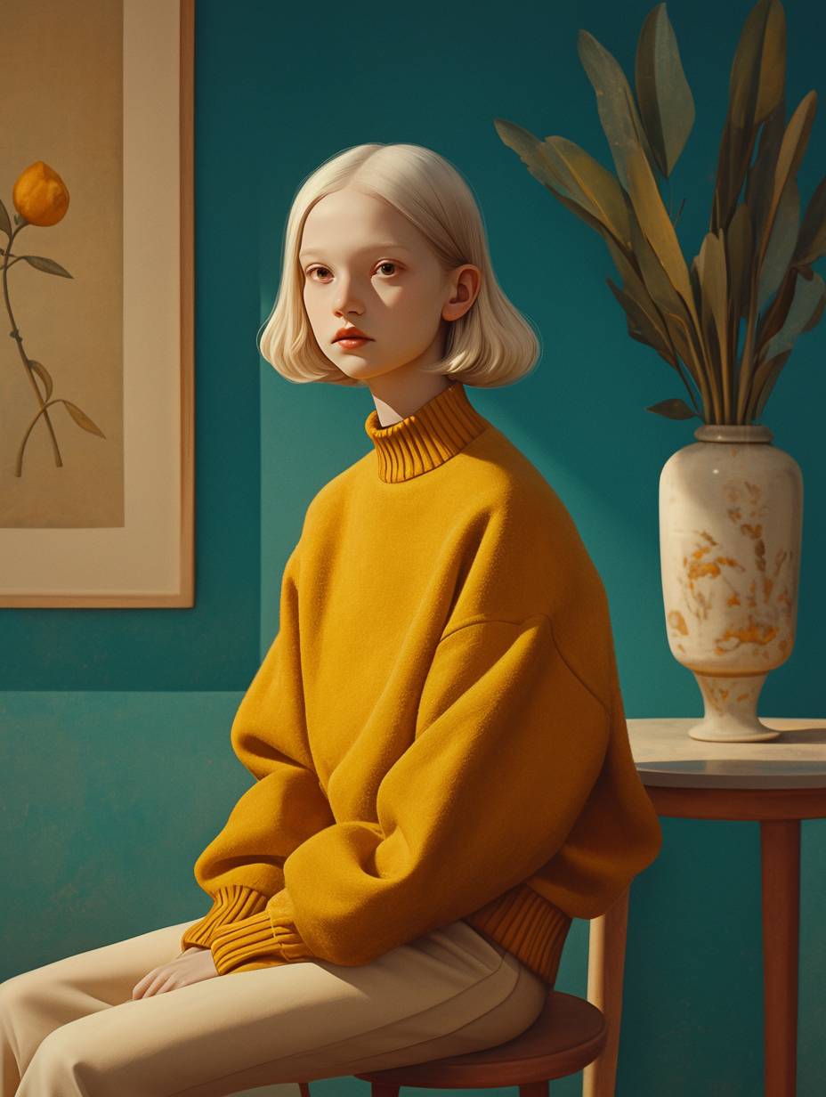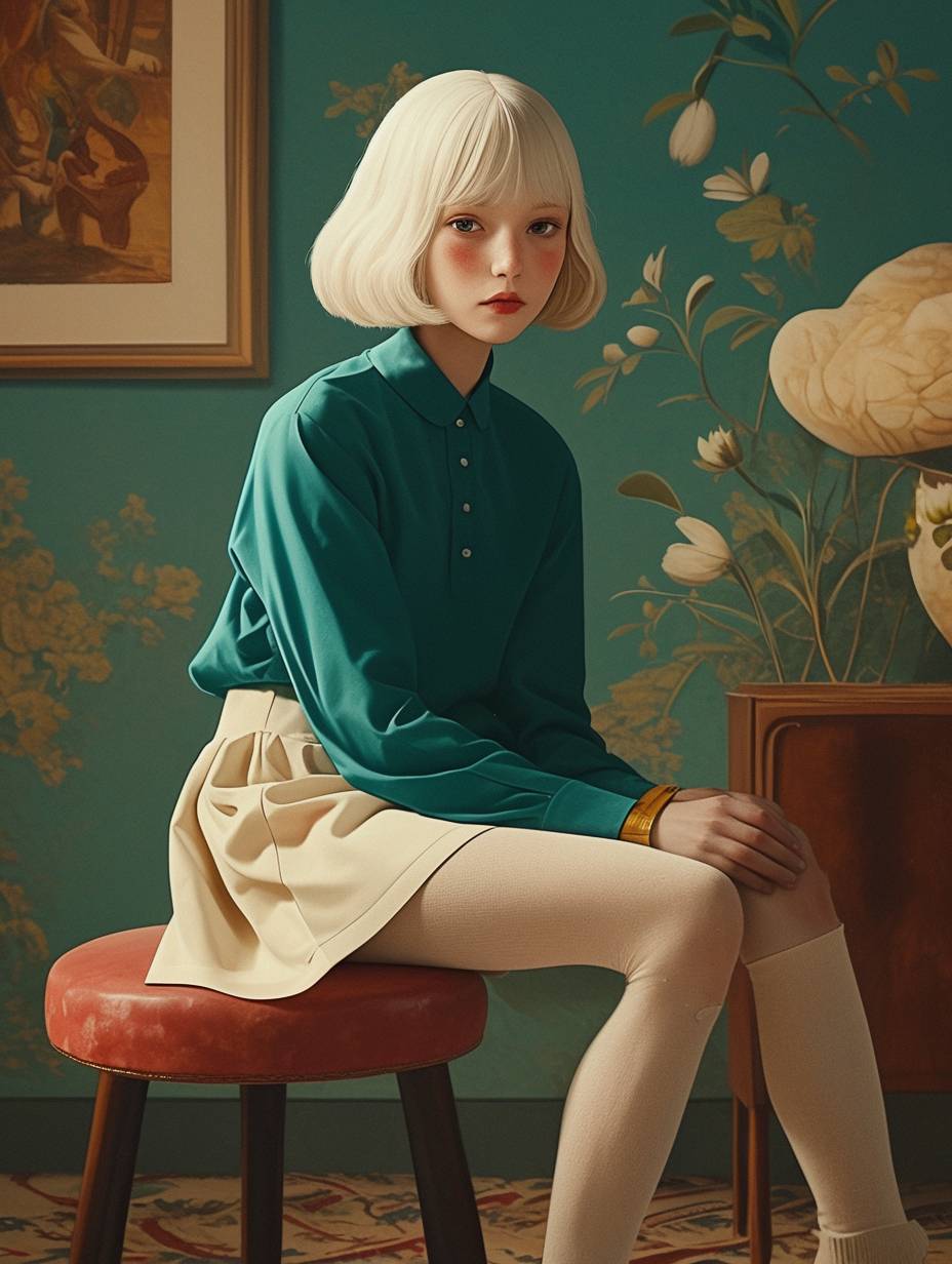 A young albino girl in a Wes Anderson style fashion shoot, sitting on a stool in a mid-century living room. --ar 3:4 --niji 6