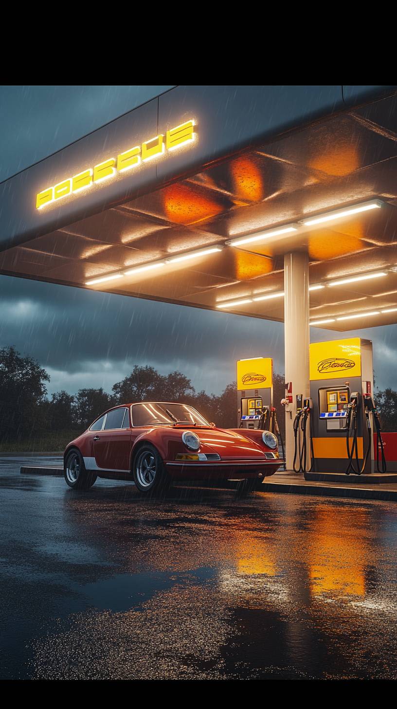 Toma cinematográfica de una gasolinera moderna con brillante marca amarilla y blanca de neón. Un Porsche 911 rojo vintage está estacionado en la gasolinera, emitiendo un sutil escape brumoso. La escena está iluminada por las luces del techo de la gasolinera y los faros de los vehículos, creando un contraste dramático contra el cielo azul profundo anaranjado con toques de lluvia. La gasolinera tiene un diseño elegante y contemporáneo con una área de servicio bien iluminada en el fondo. El suelo refleja la iluminación ambiental, realzando la sensación de fotografía automotriz de alta gama y fotorealista. La composición mantiene un tiro de gran ángulo y bajo perspectiva para una apariencia poderosa e inmersiva.