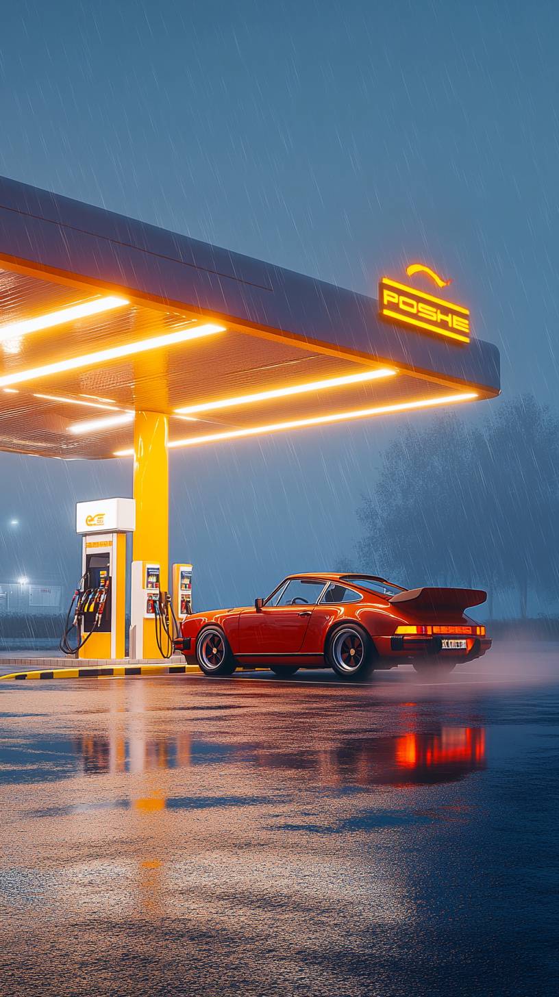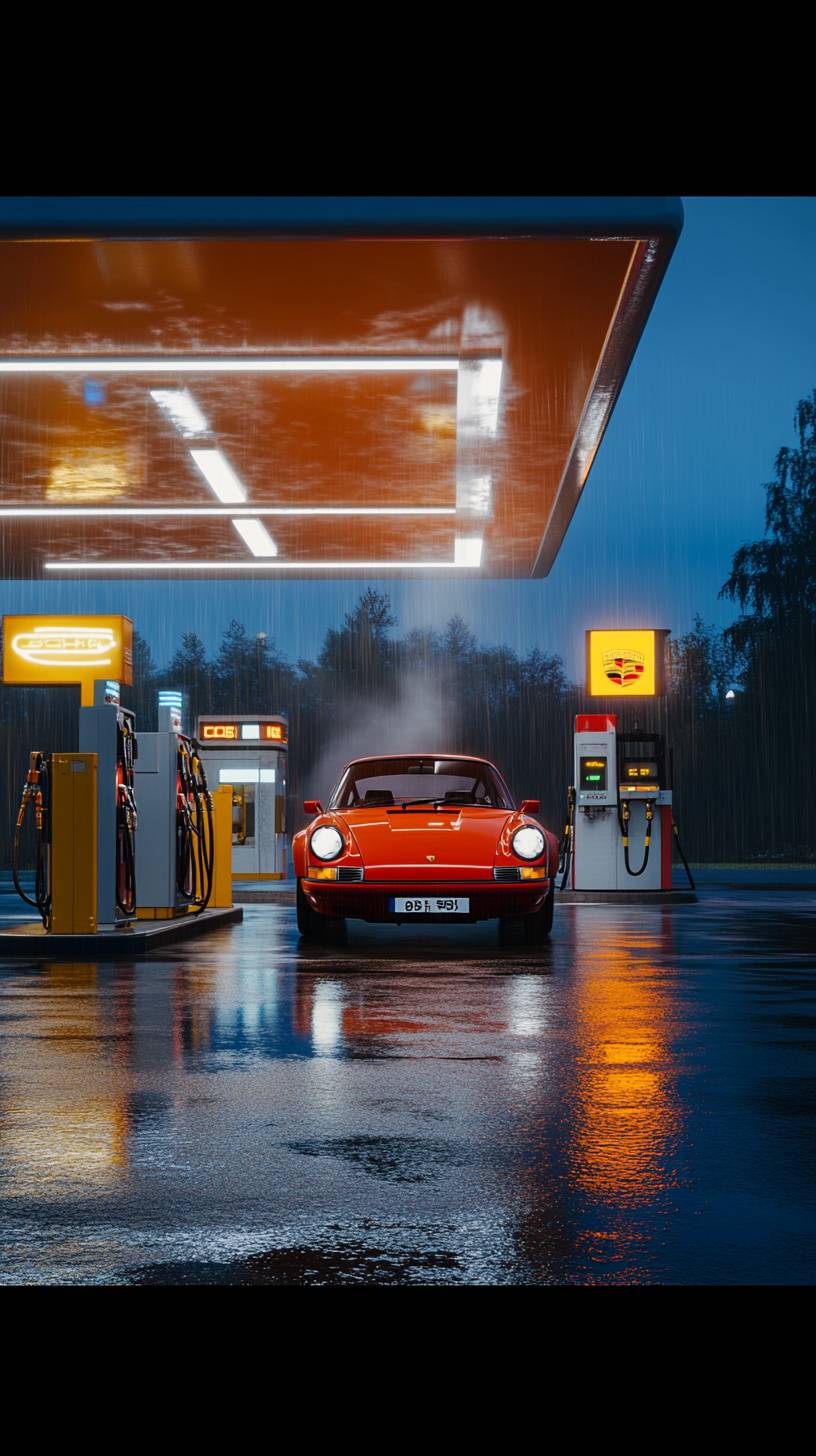 Cinematic shot of a modern gas station with bright neon yellow and white branding. A vintage red porsche 911 car is parked at the station, emitting a subtle misty exhaust. The scene is illuminated by overhead station lights and vehicle headlights, creating a dramatic contrast against the deep orange blue sky with hints of rain. The gas station has a sleek, contemporary design with a well-lit service area in the background. The ground reflects the ambient lighting, enhancing the photorealistic, high-end automotive photography feel. The composition maintains a wide-angle, low-perspective shot for a powerful and immersive look --ar 9:16 --v 6.1