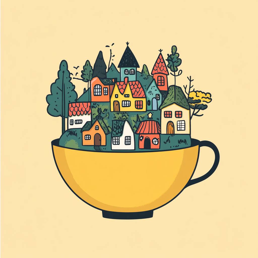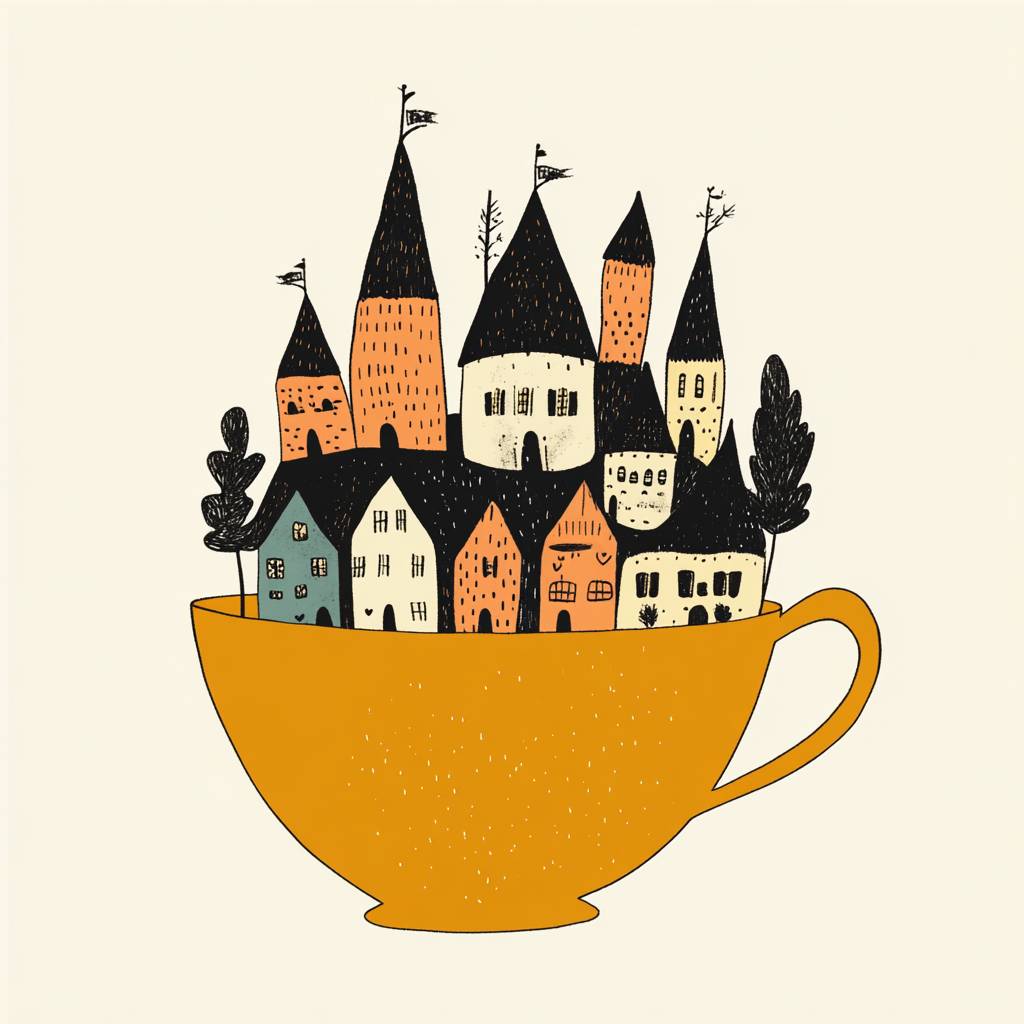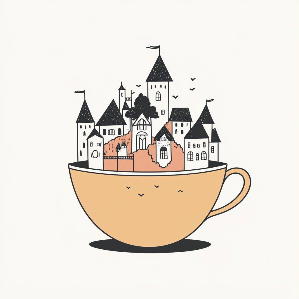 Una ilustración de una taza de té con una aldea de cuento de hadas en su interior, minimalista con contornos negros y diseño moderno.