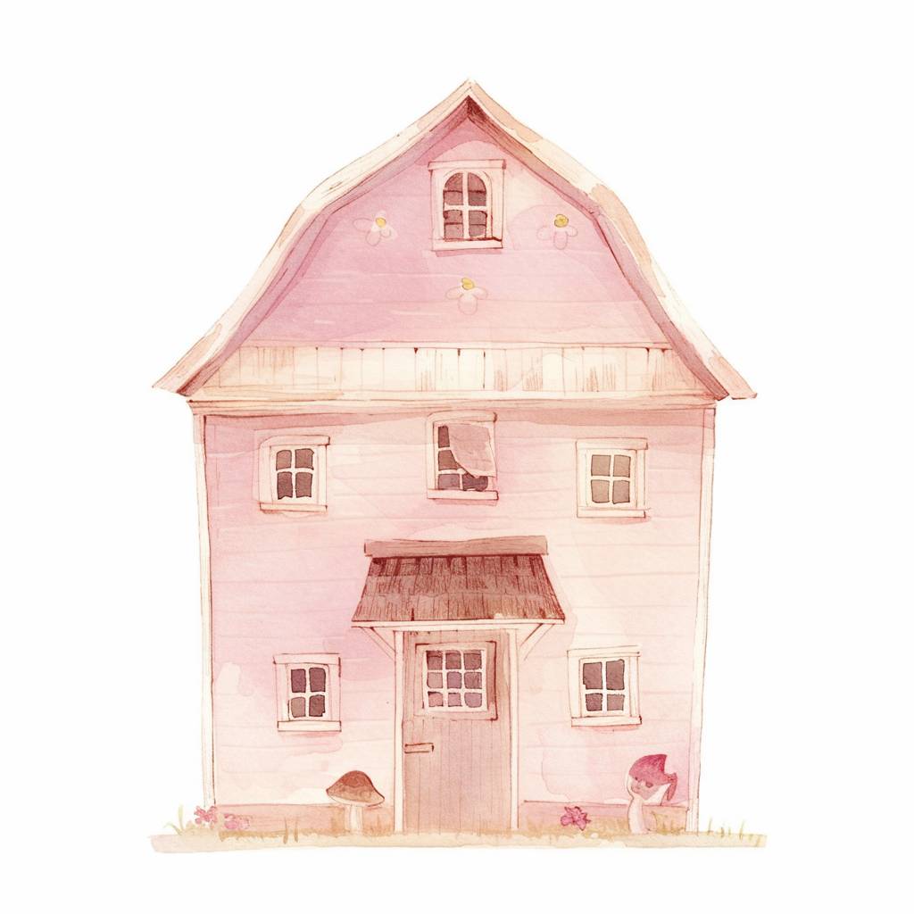 Una ilustración de acuarela de un simple granero de granja en color rosa pastel, vista frontal, en el estilo de los dibujos infantiles, inspirado en Beatrix Potter, sobre un fondo blanco.