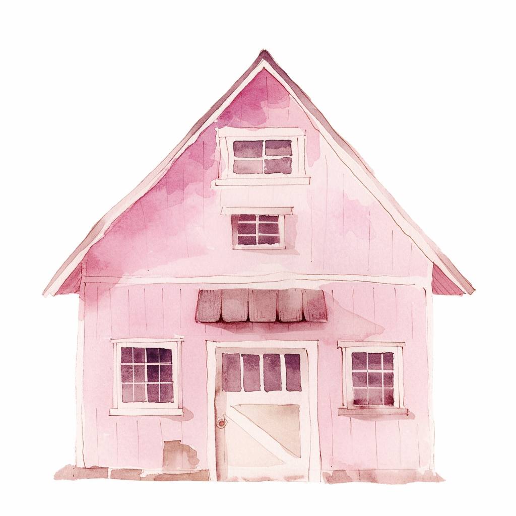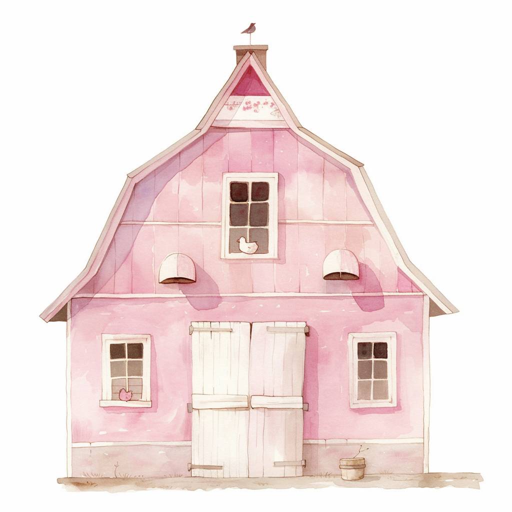Ilustración en acuarela de un simple granero rosa pastel en el estilo de dibujos infantiles, sobre un fondo blanco.