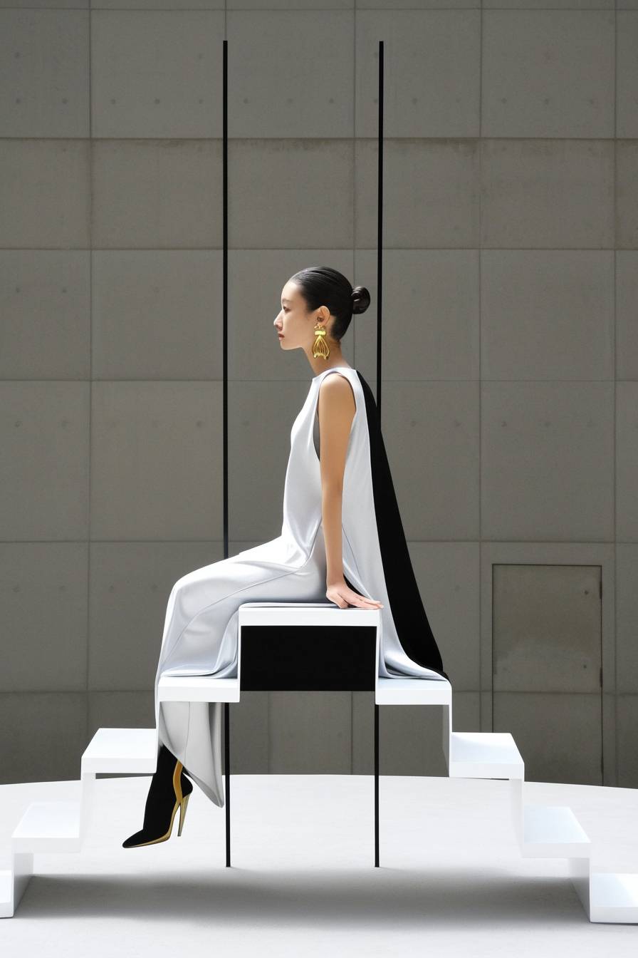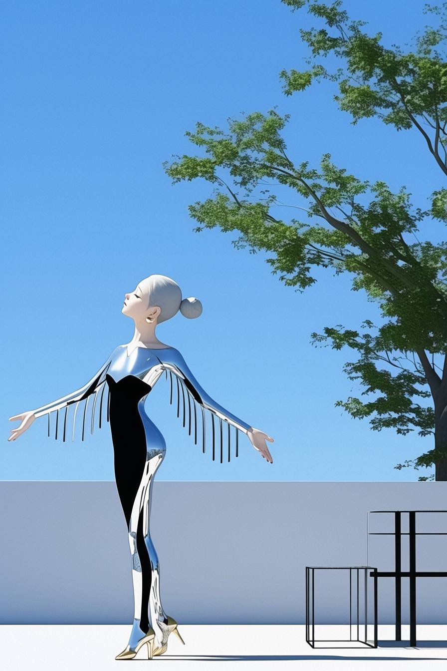 An elegant woman reminiscent of Zendaya, wearing a futuristic metallic silver jumpsuit with cut-out details, paired with sleek ankle boots and minimalistic gold accessories, her hair in a sculptural updo, set against a modern architectural backdrop, hyper-detailed, 4K clarity, soft glowing light --sref 506547990 --niji 6 --ar 2:3 --style raw
