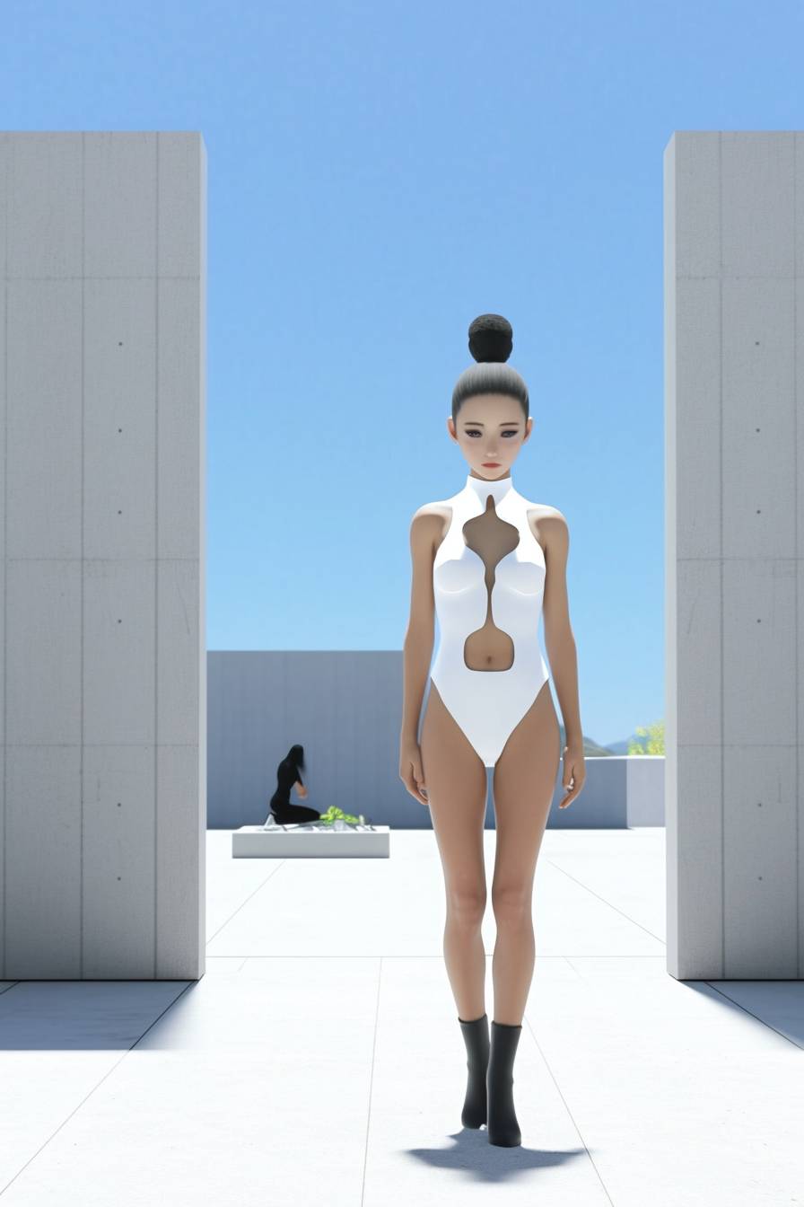 Una mujer elegante que recuerda a Zendaya, vestida con un mono plateado metálico futurista con detalles recortados.