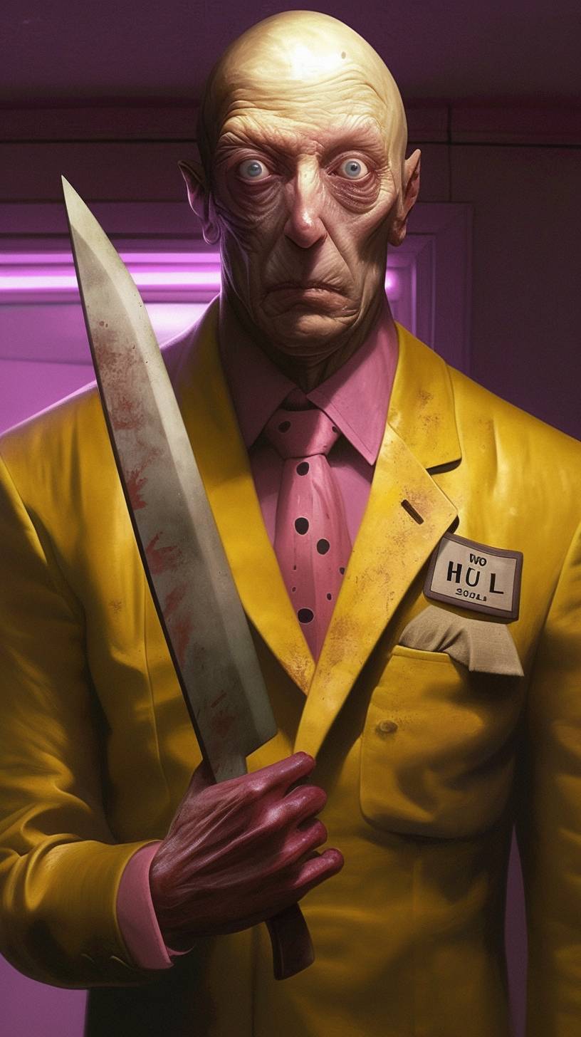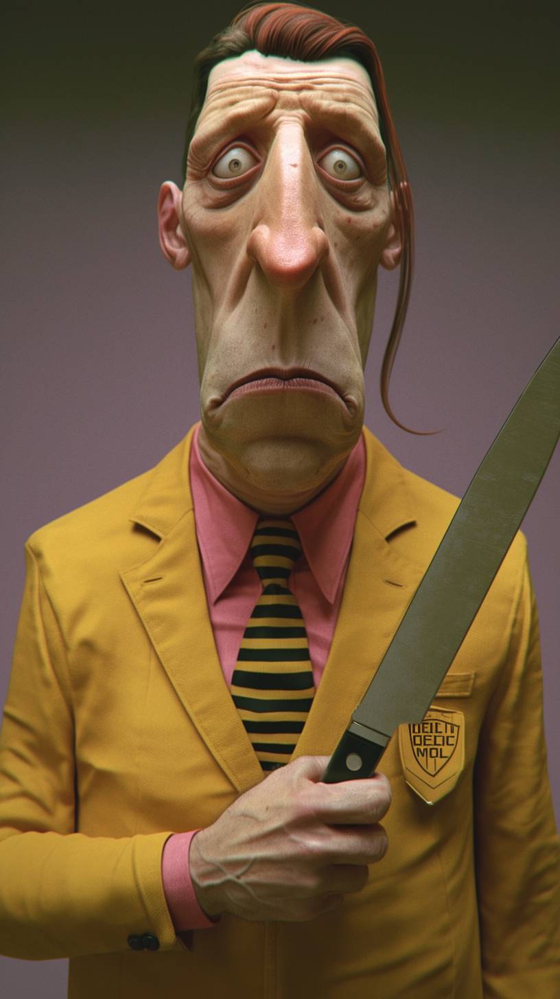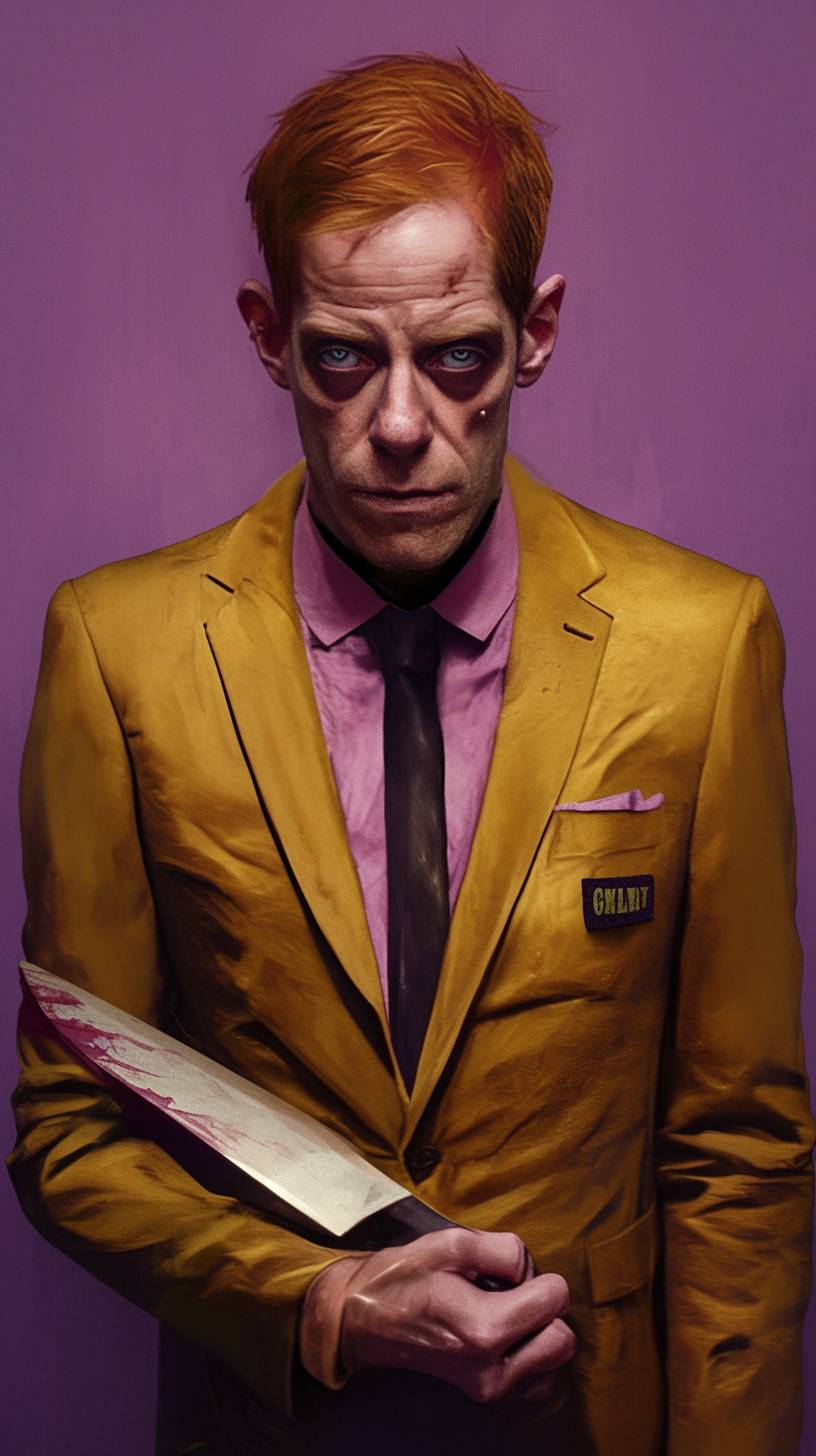 Un hombre con un gran rostro y ojos pequeños, vestido con un traje mostaza y una camisa rosa, sostiene un enorme cuchillo en un fondo violeta y ambiente inquietante.