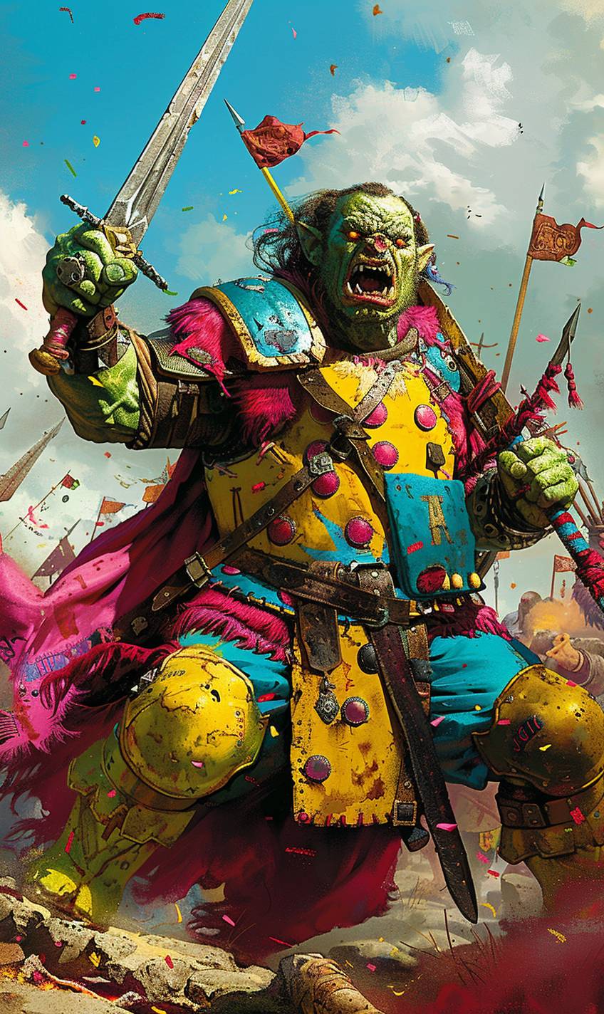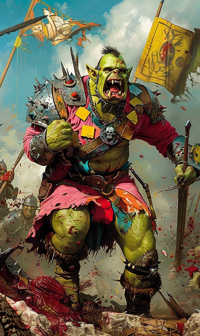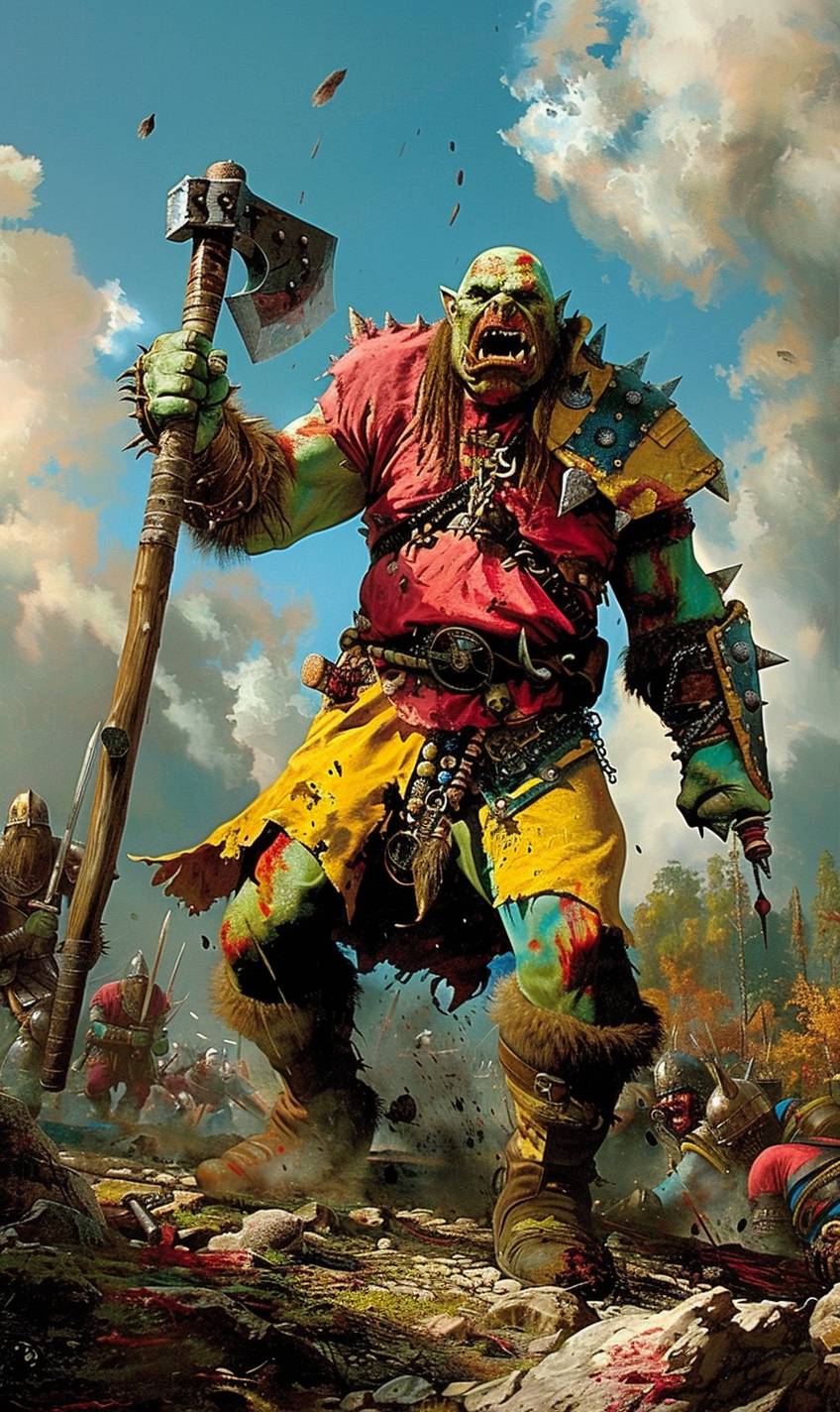 Un orco berserker con armadura pesada muestra acción dinámica en una batalla brutal.