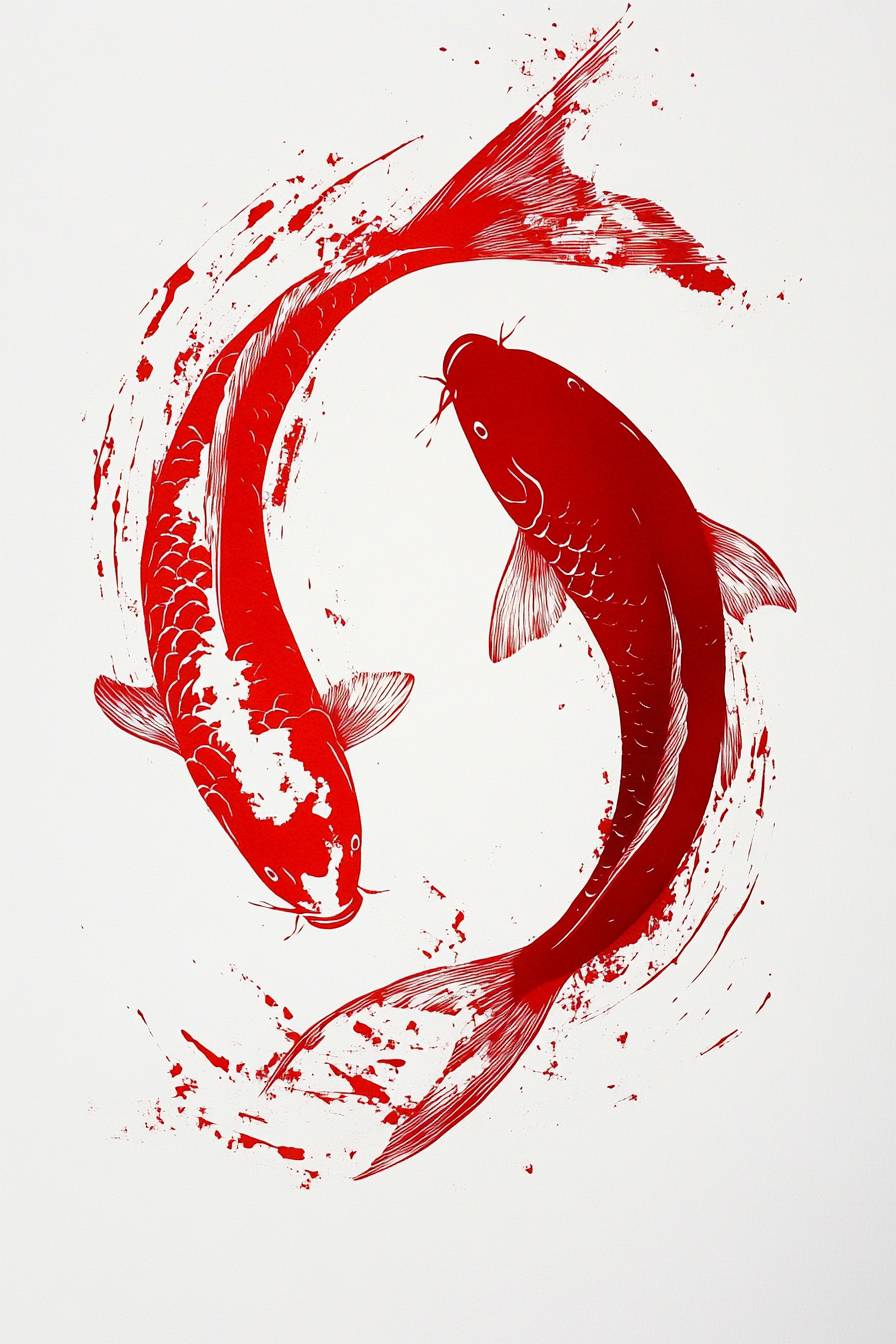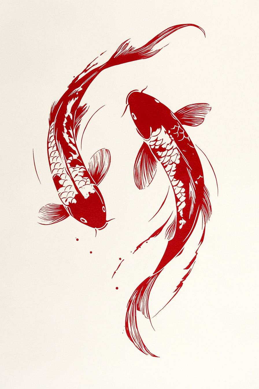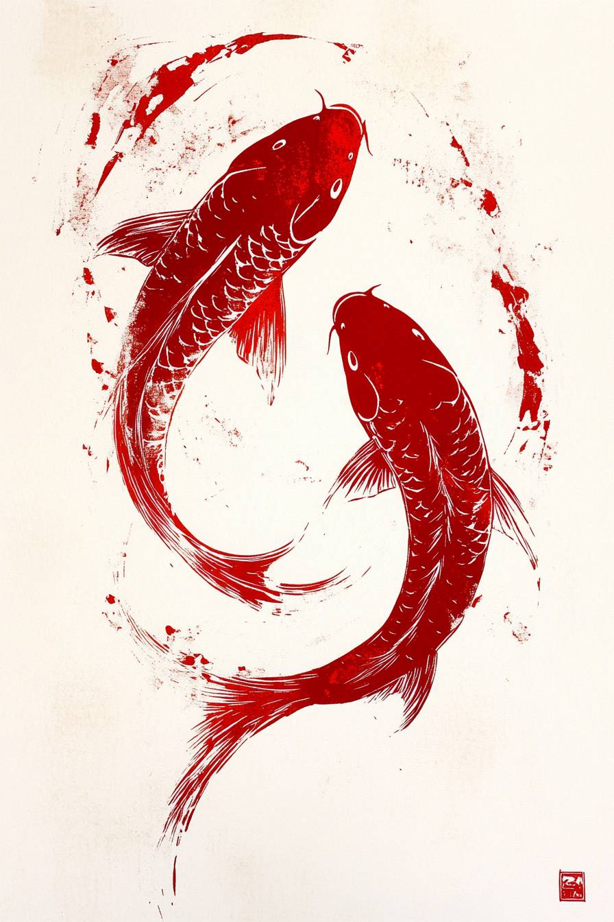 Tinta roja sobre papel crema, una simple impresión de linoleo de dos peces koi nadando en la misma dirección, mostrando sus cuerpos y colas enteras, únicamente en color rojo, con líneas simples.
