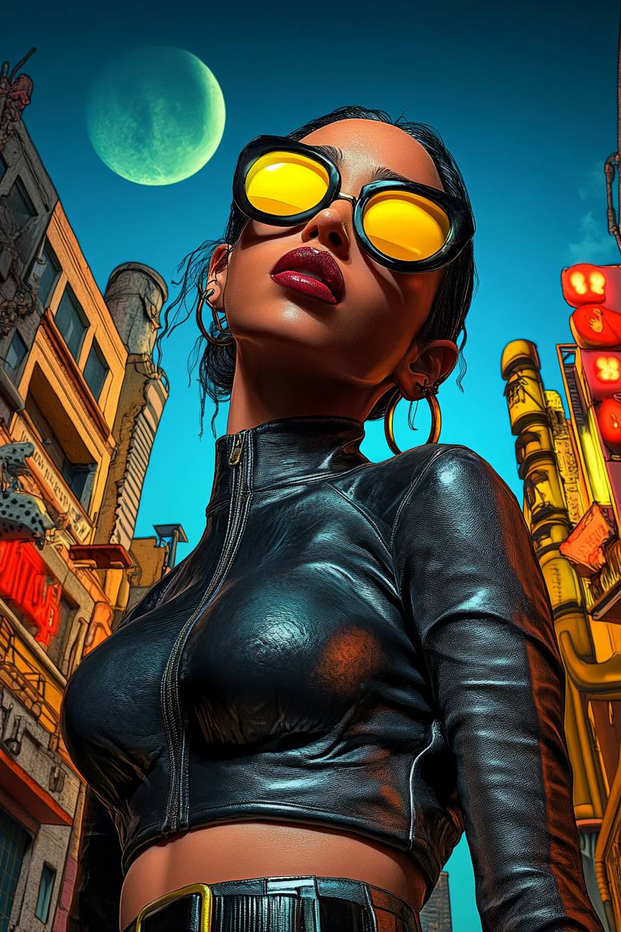 Zoe Kravitz como una asesina de anime, con un atuendo negro elegante, fondo de ciudad neón y una aura misteriosa.