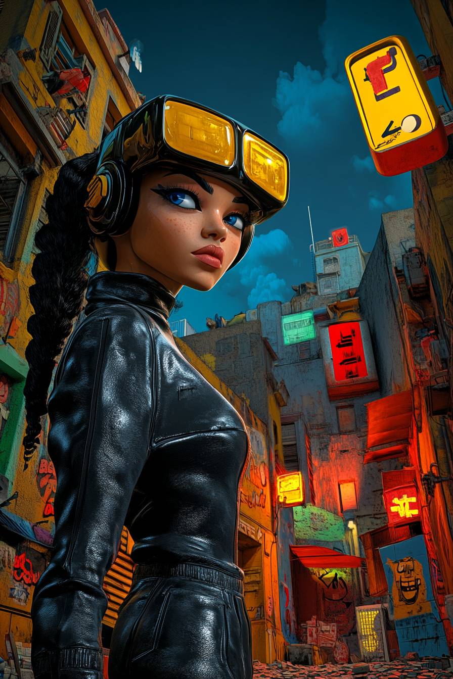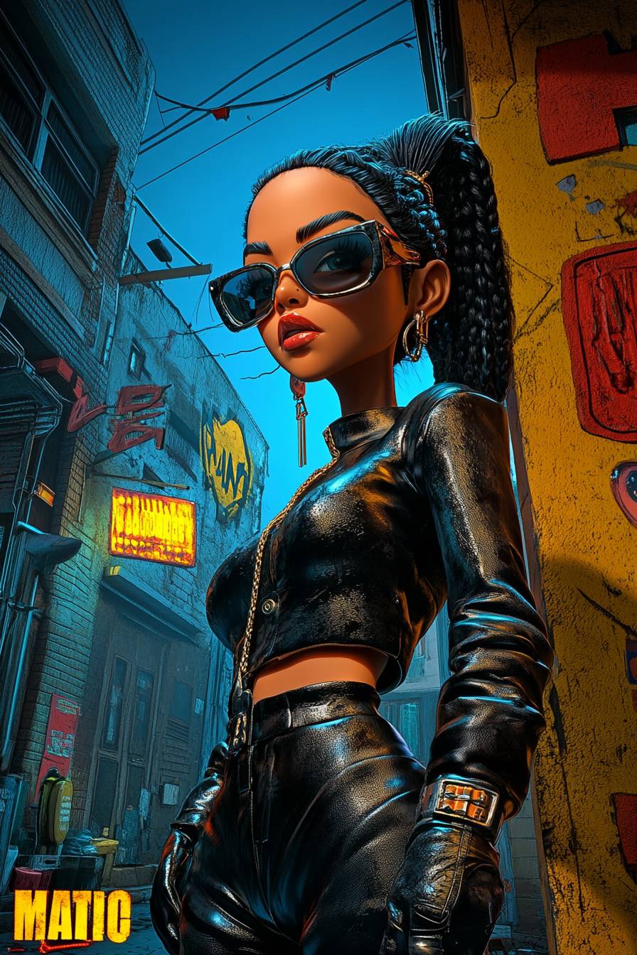 Zoe Kravitz as an anime assassin, sleek black outfit, neon cityscape backdrop, mysterious aura. --sref 199727834 --p 9crcw4d --c 20 --sw 1000 --s 1000 --ar 2:3 --v 6.1