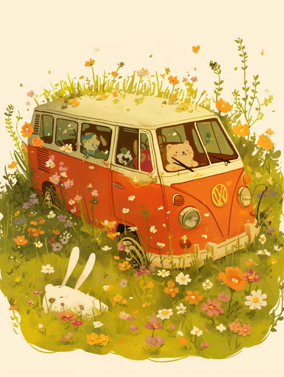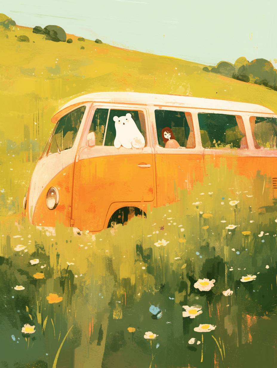 Spring is full of vitality, There is a bus on the grassland, simple and fresh, There is a white teddy bear sitting on the grass, cute illustration, illustrated in whimsical style, simple and clean illustration, hand drawn illustration, cute artwork, illustration!, illustrations, by Lynda Barry, simple details, minimalist --ar 3:4 --niji 6